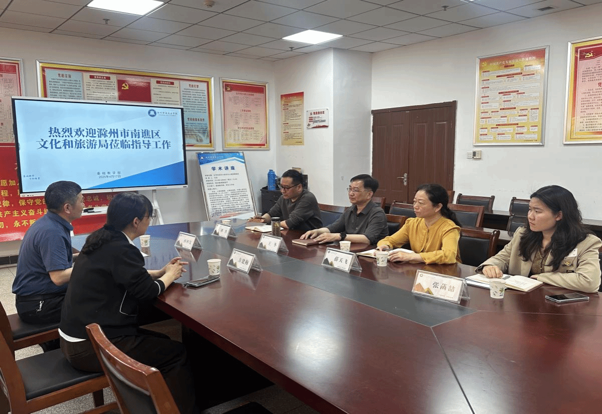 4月17日下午,南谯区文化和旅游局党组成员、副局长方建梅、南谯区文化馆馆长孙怀发一行赴我校调研省级非遗项目南谯民歌的校地合作、传承保护情况。校党委委员、宣传统战部部长王冬,基础教学部党总支书记薛天飞、副主任(主持工作)刘杰及相关美育教师陪同调研。