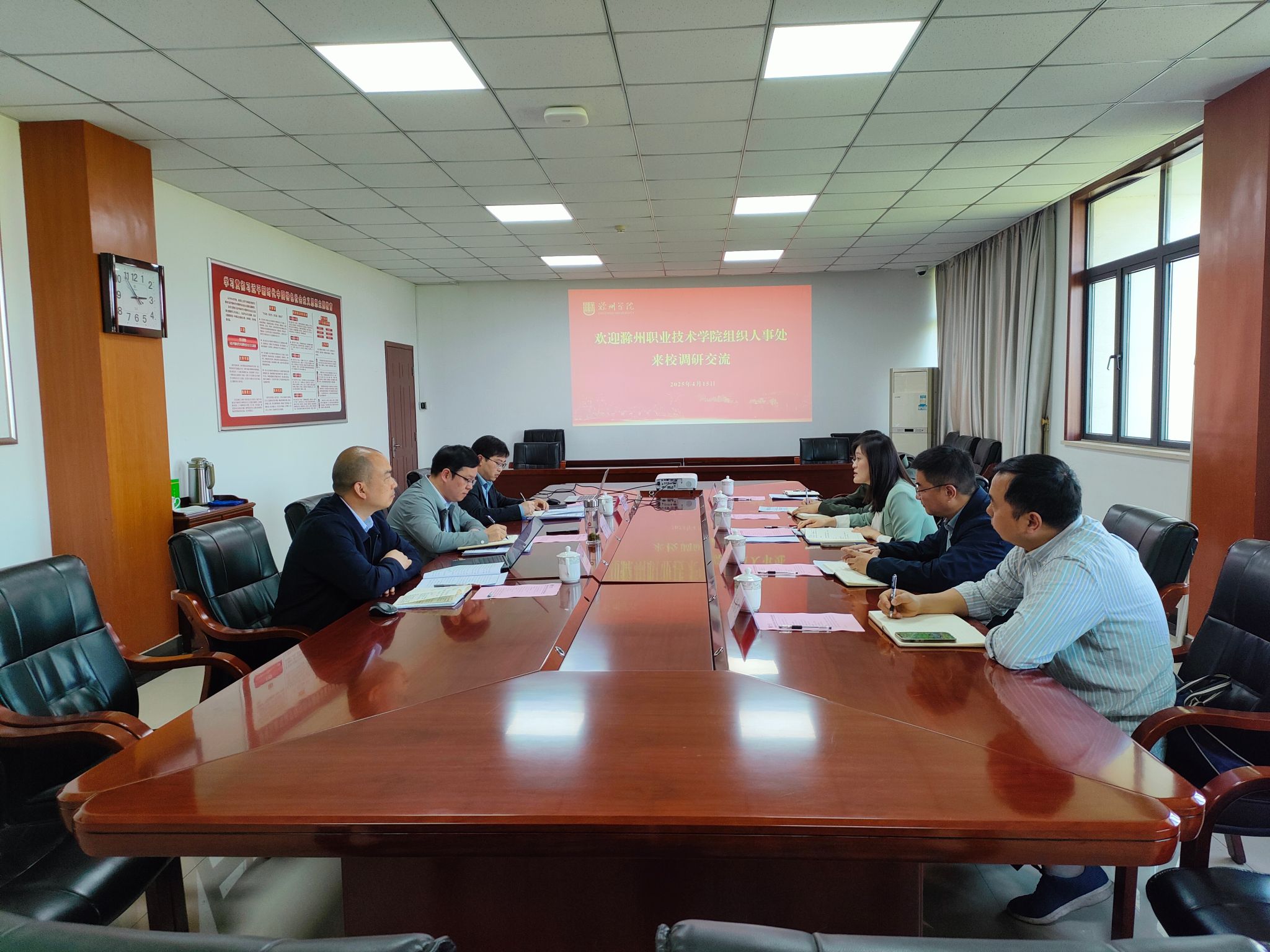 为进一步夯实学校党建基础,充分发挥目标绩效考核在学校各项工作中的“指挥棒”作用,4月15日,校党委委员、组织人事处处长王宇带队赴滁州学院就目标绩效考核与党建“双创”方面工作进行了调研,质量管理中心主任吴昌雨、办公室副主任陈保中和有关人员随同调研。滁州学院党委委员、组织部部长丁荣祥,副部长刘克忠、干部科科长曹文涛热情接待了王宇一行。