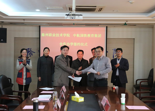 2月26日下午,中航国铁教育集团安徽分公司总经理谢绍华一行来我院交流工作并签订校企合作协议,院长李柱梁,副院长汪上出席签约仪式,教务处、招生就业处、经济贸易系等部门相关人员参加签约仪式。