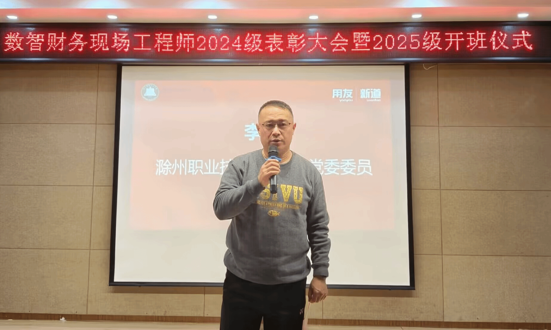 10月29日,我校管理学院联合财经数智化领域龙头企业——用友·新道科技股份有限公司,举行新道数智财务现场工程师2024级订单班表彰大会暨2025级订单班开班仪式。校党委委员、商学院党总支书记李超出席并致辞,教务处处长唐义武、招生就业处副处长周多道、管理学院党总支书记何文婧、管理学院副院长颜洲,新道科技股份有限公司安徽分公司的总经理王小明、高级教育规划顾问李磊、校企合作经理李云翔及订单班全体师生参会。