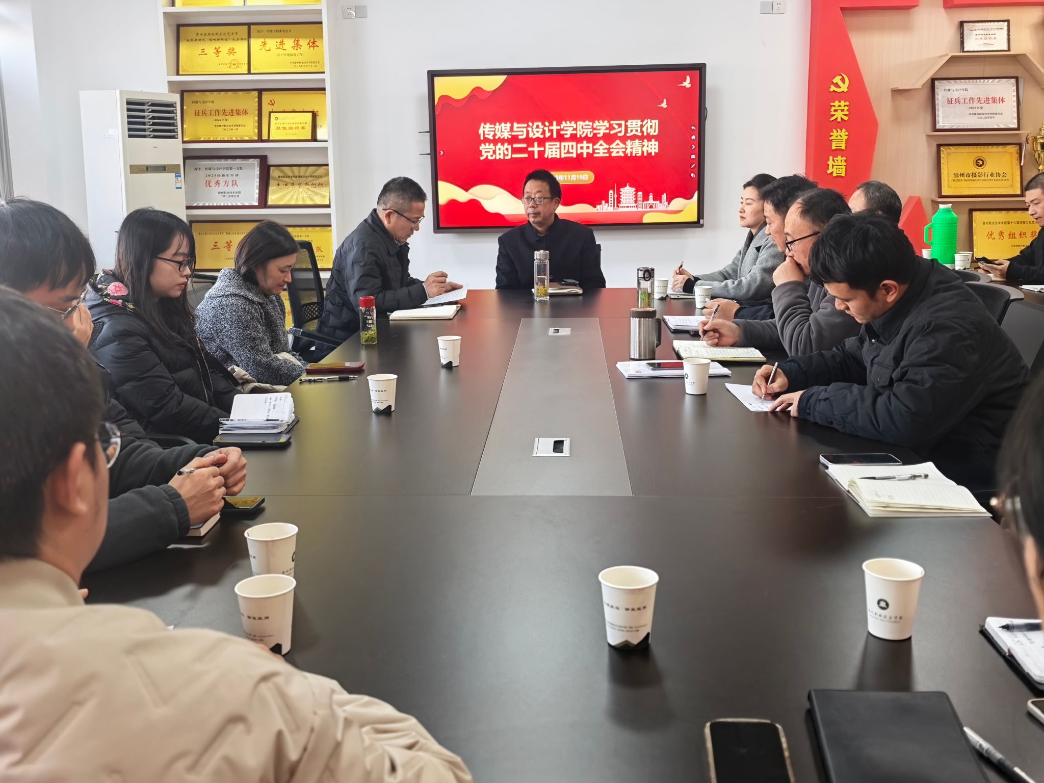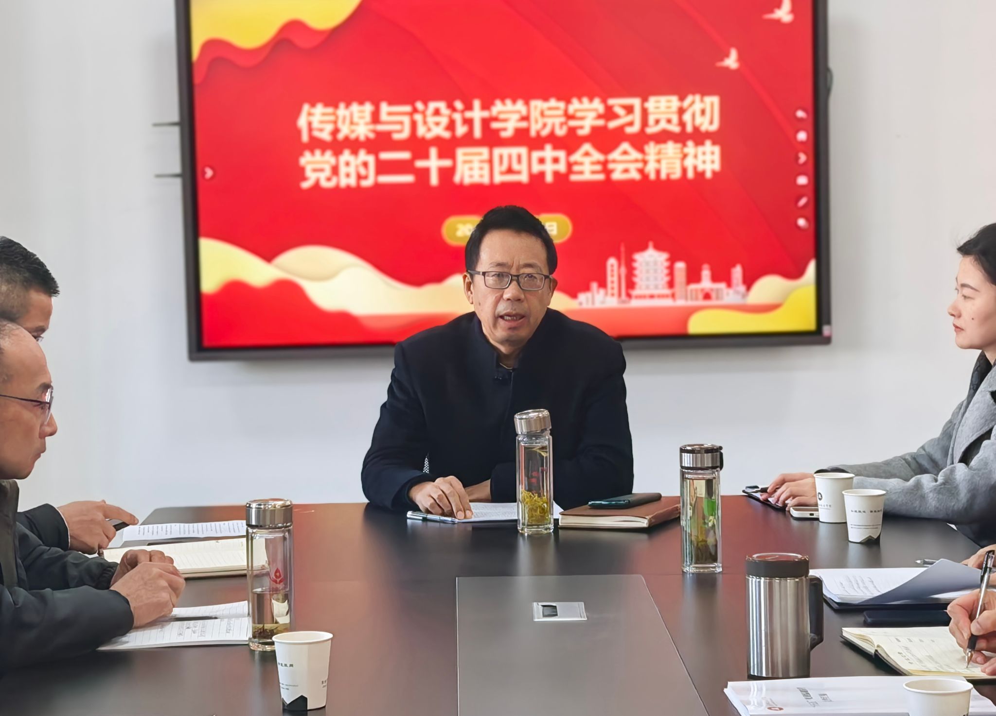 11月19日下午,校党委委员、工会主席李平权深入传媒与设计学院宣讲党的二十届四中全会精神,学院全体党员教师参会。