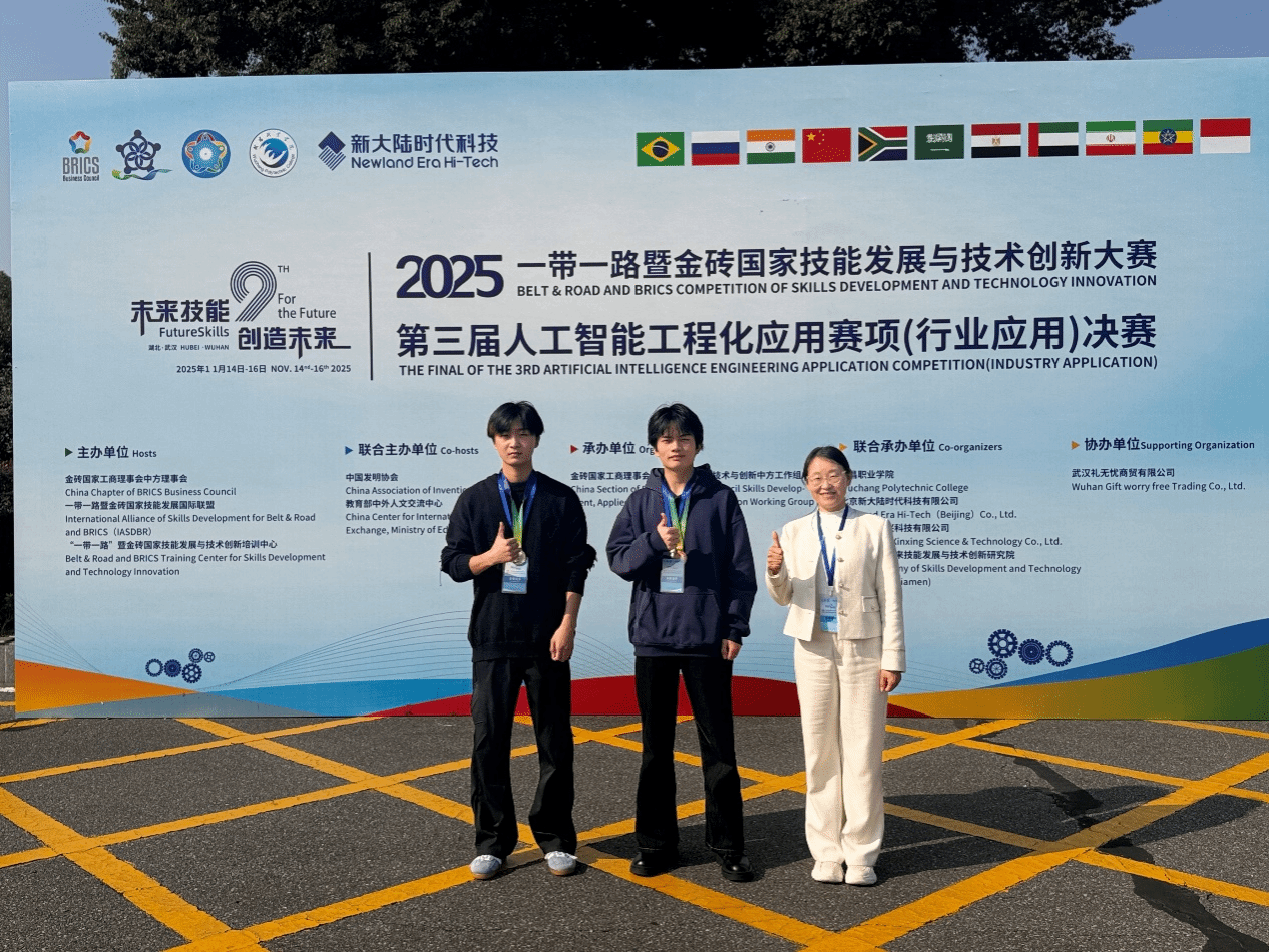 11月15日,2025“一带一路”暨金砖国家技能发展与技术创新大赛第三届人工智能工程化应用赛项(行业应用)全国总决赛在武汉武昌职业技术学院顺利开幕。我校信息工程学院23级物联网班于治豪、24级物联网班吴天明两位同学在全国多支队伍、数百名选手的激烈角逐中脱颖而出,分别斩获二等奖、三等奖,滁州职业技术学院荣膺“优秀组织奖”。