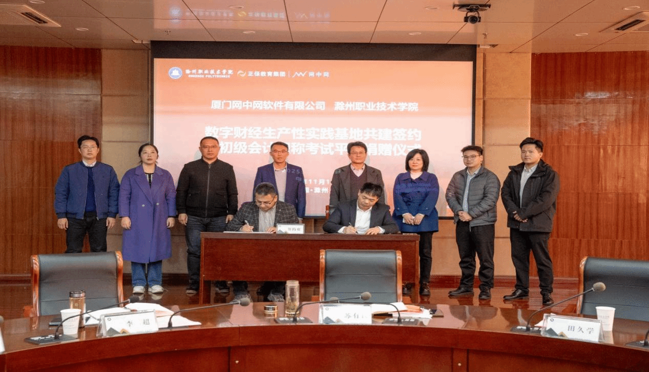 11月19日,滁州职业技术学院管理学院与厦门网中网软件有限公司联合举行“数字财经生产性实践基地”共建签约暨初级会计职称考试平台捐赠仪式。校党委委员、副校长苏有良出席活动并致辞,校党委委员、商学院党总支书记李超、计划财务处处长王蓓蓓、校企合作办公室主任周多道、管理学院党总支书记何文婧、管理学院副院长颜洲,厦门网中网软件有限公司副总裁田久学、院校事业部总经理李邦勇、安徽省区域经理刘家乐、实施经理余智洋及管理学院师生代表参会。