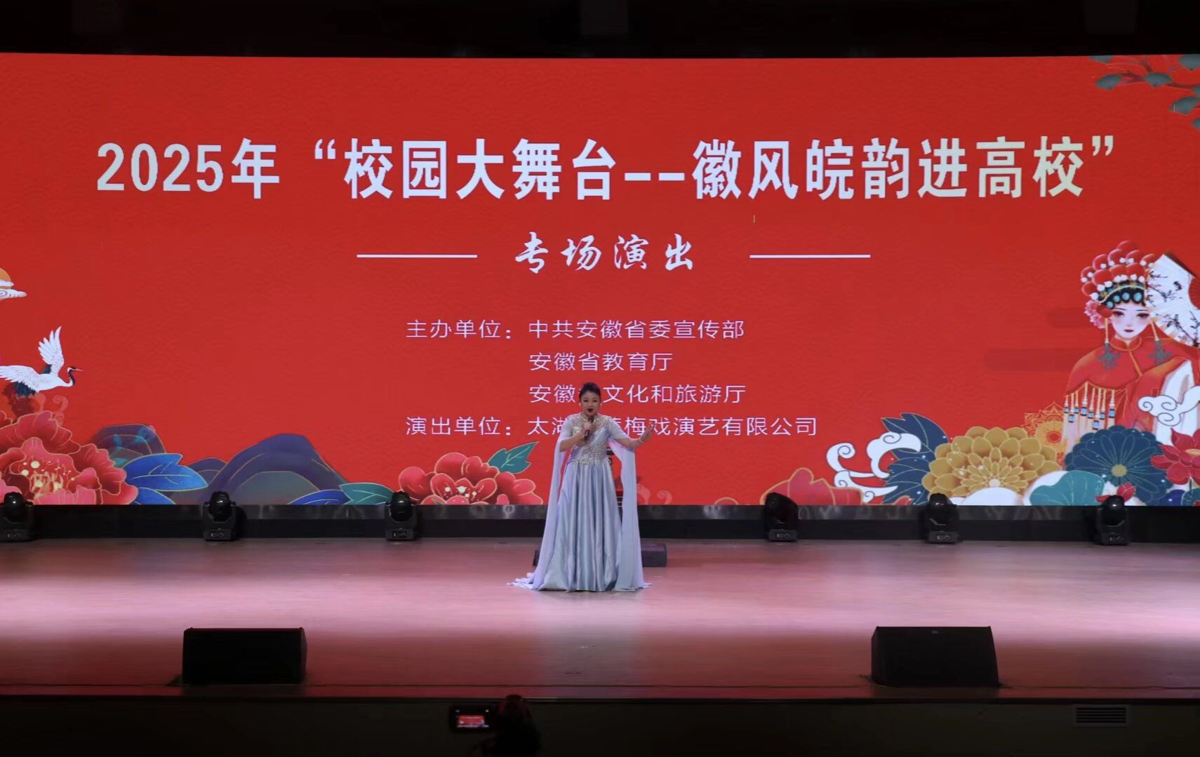 12月2日下午,中共安徽省委宣传部、省教育厅、省文化和旅游厅联合举办的2025“徽风皖韵”进高校活动在我校大礼堂精彩上演。本次活动由安庆市太湖县黄梅戏演艺有限公司倾情演绎,现场800名师生共同观演,活动同步线上直播,让更多师生共赏黄梅戏艺术经典雅韵。