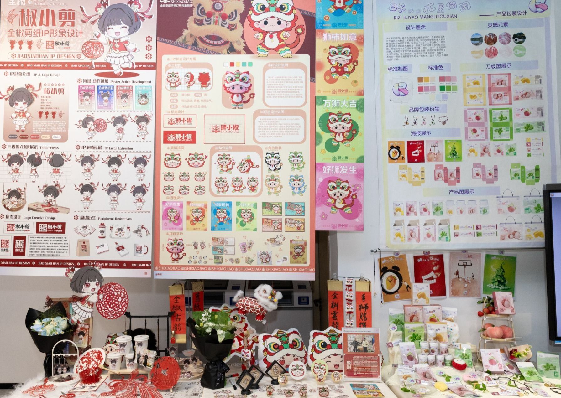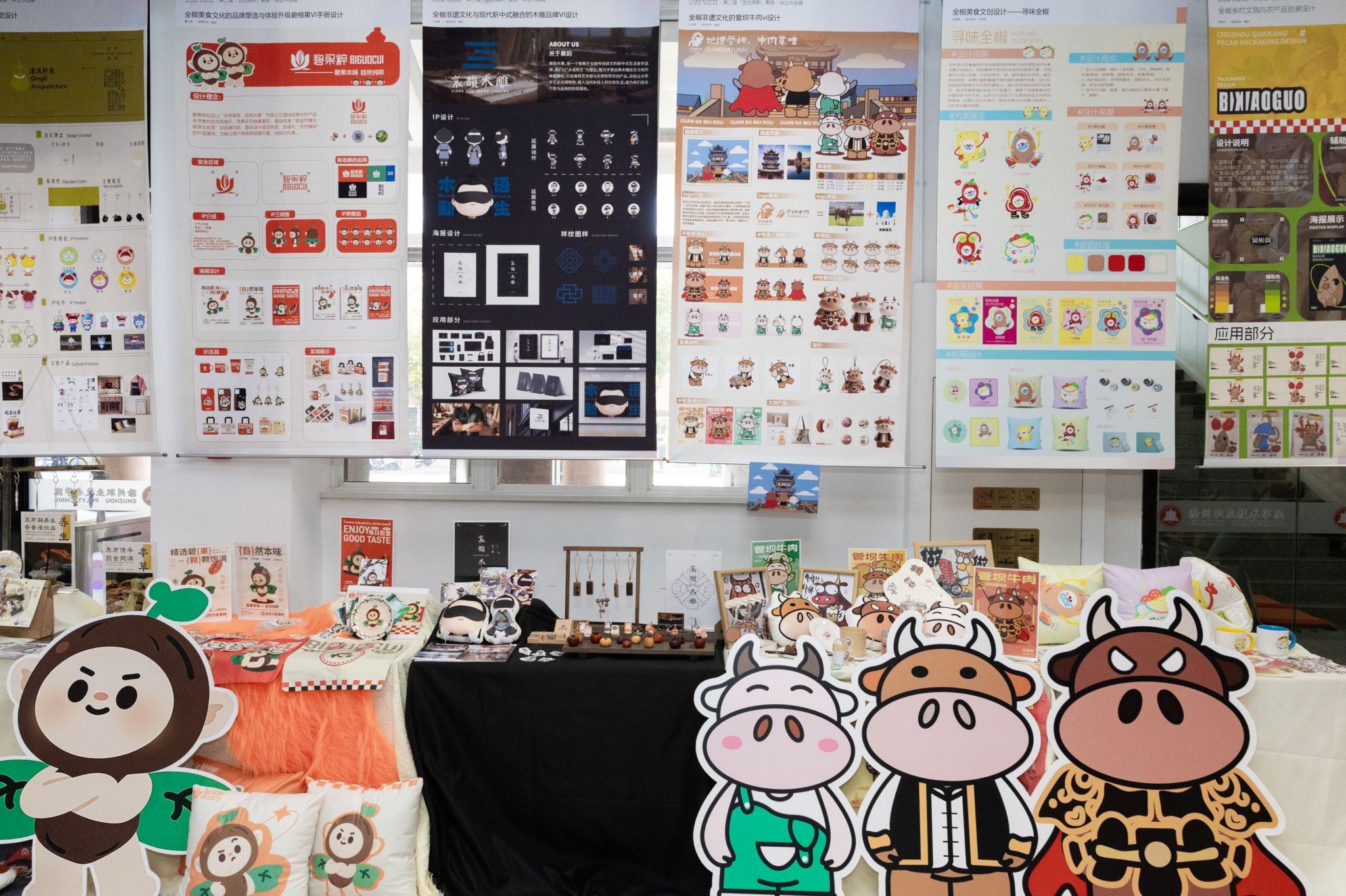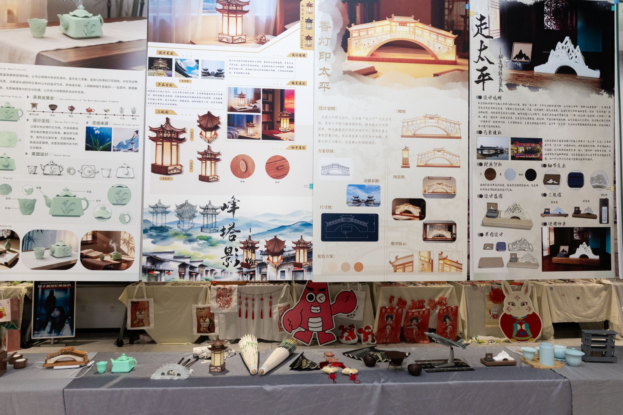 本次展览紧紧围绕“成长聚焦、成果聚焦、城市聚焦”三个维度展开。展品不仅体现了学生们在专业领域的设计能力,更凸显了其扎根滁州、服务地方的创作导向。许多作品巧妙融入了琅琊、全椒等地的文化元素,并通过人工智能等数字技术进行现代转译,展现了设计赋能文旅、服务产业的探索与实践。例如,在IP形象设计领域,“马厂羊肉面”“全椒碧根果”“全椒小龙虾”“酥笏牌”等当地美食化身为憨态可掬的卡通代言人,让全椒美食文化变得亲切可爱;在民俗活动视觉转化方面,学生围绕非遗 “正月十六走太平”“全椒剪纸”“八朵云”“手狮灯”等创作了系列海报与动态标识,实现了从传统到当代的“设计转译”;在产品设计方向,“儒林外史”系列宫灯、走马灯,太平文化系列手办及融合“全椒十景”元素的茶具、文具等文创产品,让地域文化融入日常生活的美学体验;在人文建筑主题类,以VI设计的形式构建城市建筑、历史人物品牌形象,重构“琅琊印象”“全椒印象”视觉体系。作品不仅体现了设计艺术系师生扎根优秀传统文化,更是通过年轻化的设计语言,为全椒文旅形象的提升、特色产品的推广及非遗的活化传播,提供了富有新意的解决方案与切实可行的视觉载体。