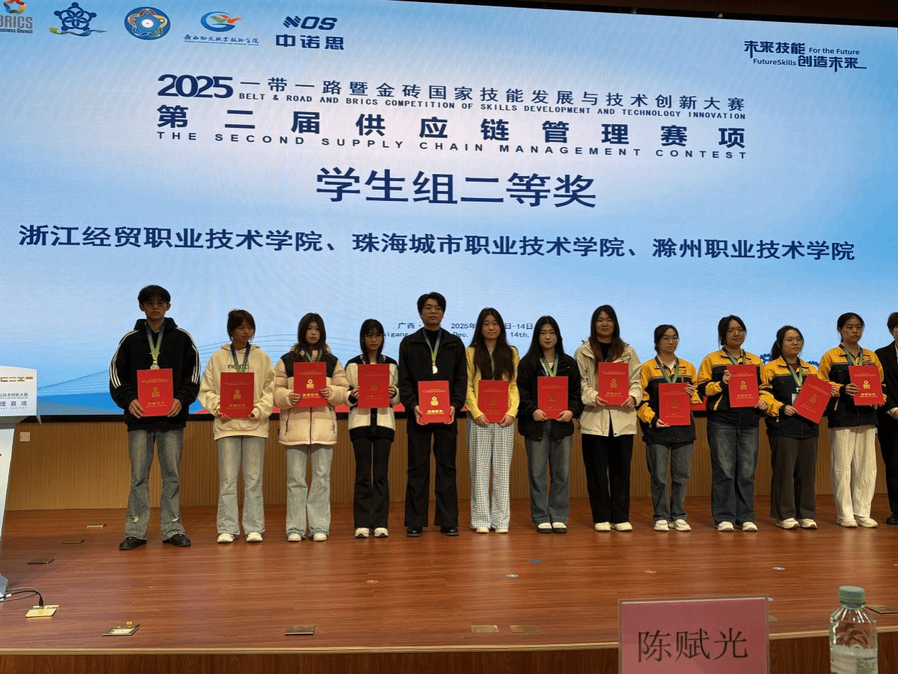 12月12日至15日,由金砖国家技能发展与技术创新大赛组委会主办的第二届供应链管理赛项全国总决赛在广西物流职业技术学院成功举办。我校商学院现代物流管理专业谢天城,王瑞圆,黄思维,陈菲四位同学在全国多支队伍的激烈角逐中脱颖而出,凭借扎实的专业知识和出色的团队协作,斩获二等奖,滁州职业技术学院荣获“优秀组织奖”。