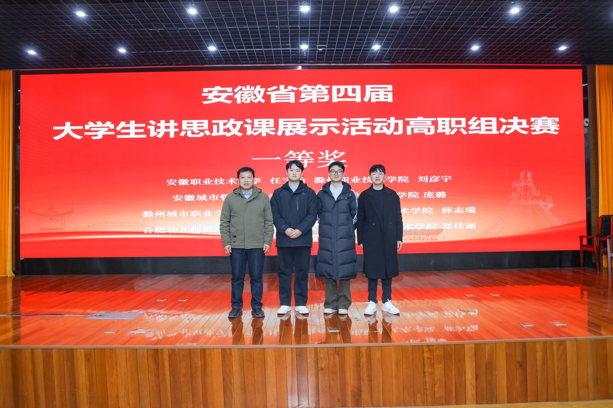 为深入学习宣传贯彻党的二十大及党的二十届四中全会精神,推进大学生主动学习宣传习近平新时代中国特色社会主义思想,引导广大青年学生热爱思政课、学好思政课,12月19日,由中共安徽省委教育工委主办,安徽职业技术大学承办的安徽省第四届大学生讲思政课展示活动高职组决赛在合肥举行。我校由汪立超、许红雷老师指导的刘彦宇、杨东两位同学在决赛中脱颖而出,取得一等奖的好成绩,实现新突破。