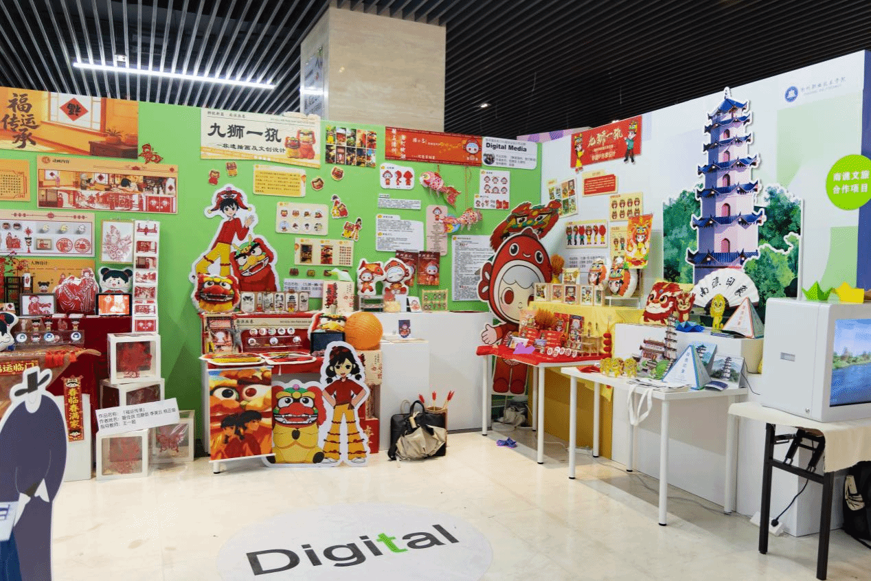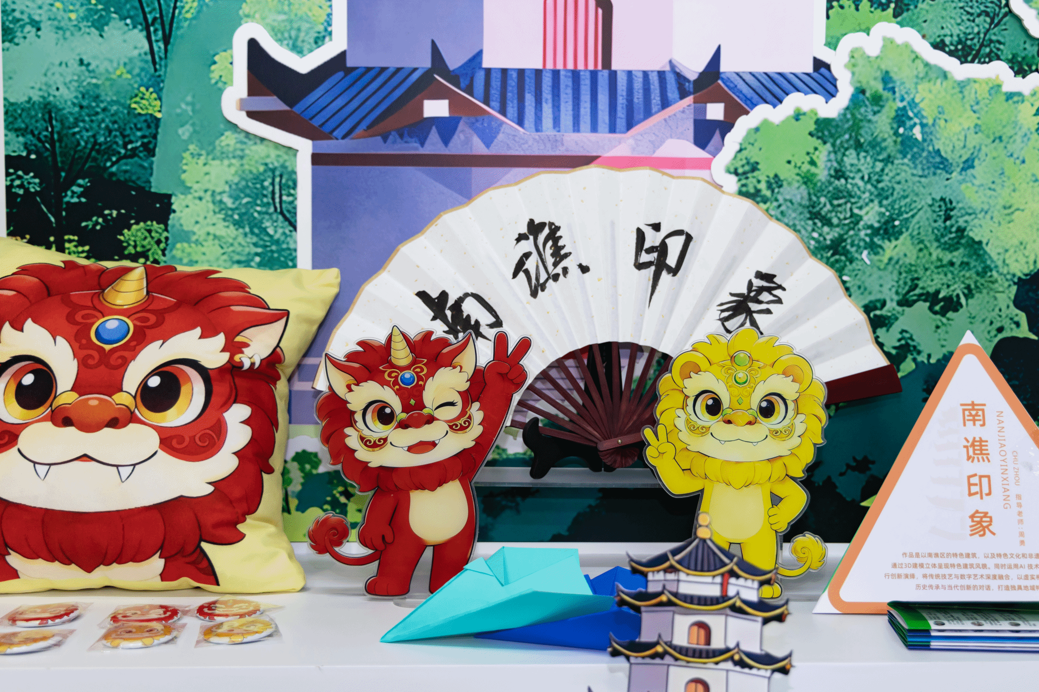 非遗展区以“让传统在数字时代活起来”为旨,实现传统文化从“静态展示”到“动态参与”的转变,为非遗传播提供年轻化、数字化的新范式。“九狮一犼”非遗活化,用十余幅生动插画,细腻描绘狮子守护、嬉戏、舞动等多重形态,巧妙串联南谯大地上的自然风貌与深厚的民间舞狮传统;《福运传承》创新融合二维动画与传统剪纸艺术,细腻呈现祖孙日常与福运传承的坚守,以“福字倒贴”的经典传说,讲述文化的代代相传,勾勒出民俗与温情;《双条鼓响·潮启非遗》提取拨浪鼓、传统服饰纹样等非遗符号,重塑凤阳花鼓文化传播路径,作品融合“非遗+科技”,打造线上动态数字藏品与线下智能文创周边。既保留非遗文化的情感内核,又通过科技手段打破场景边界。