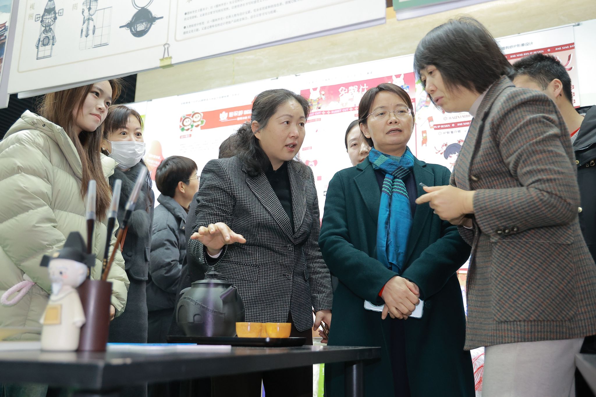 开展前,骨干教师团队在一楼手作教室为滁州广播电视小记者团带来了一场“冬至焕新·水墨传薪”艺术体验工作坊活动,大学生和小朋友们共同感受冬至节气背后的文化意蕴。小记者们在展位跟前沉浸式体验滁州地方文化的“创意之旅”。