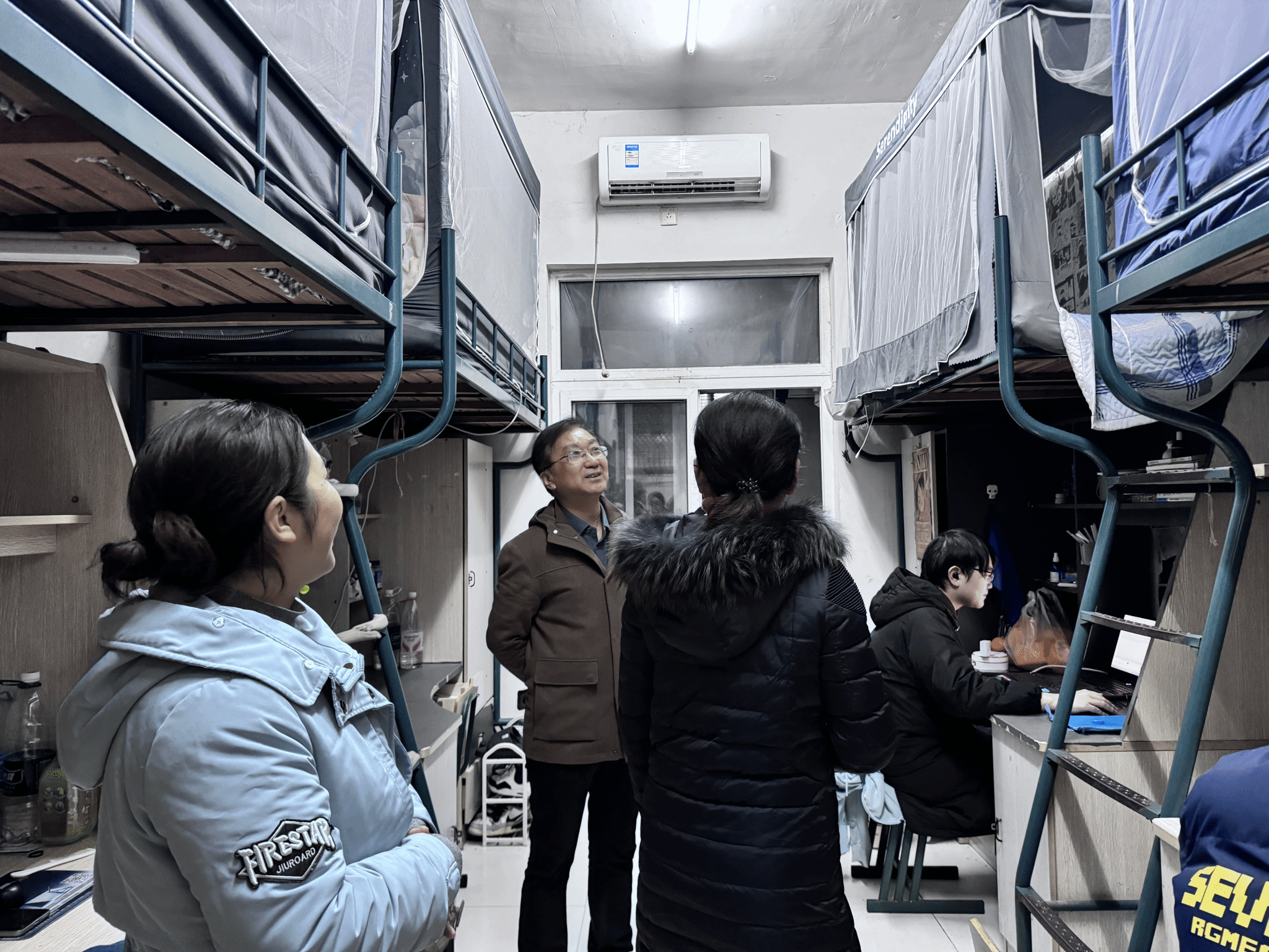 在走访检查过程中,王冬一行仔细查看了宿舍的卫生状况、用电安全及公共设施维护情况,与同学们亲切交流,关心询问期末备考情况及假期安排,提醒同学们注意防寒保暖和身心健康,详细了解大家的学习生活近况和实际需求。王冬强调,学生宿舍是同学们生活、学习的重要场所,保持良好的环境卫生和安全的居住条件至关重要。他叮嘱同学们要增强安全意识,遵守校纪校规,共同营造整洁、和谐、安全的宿舍氛围。