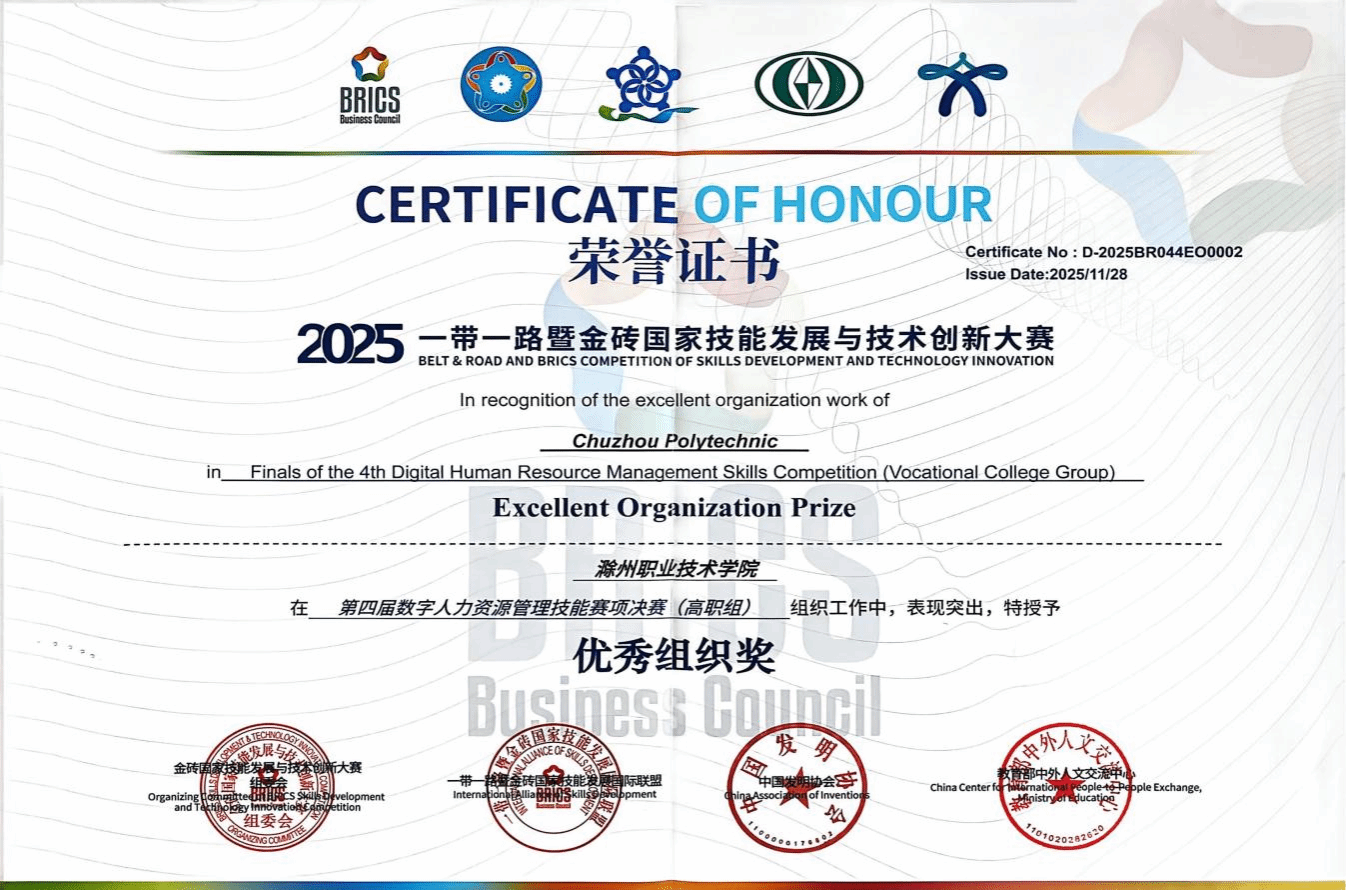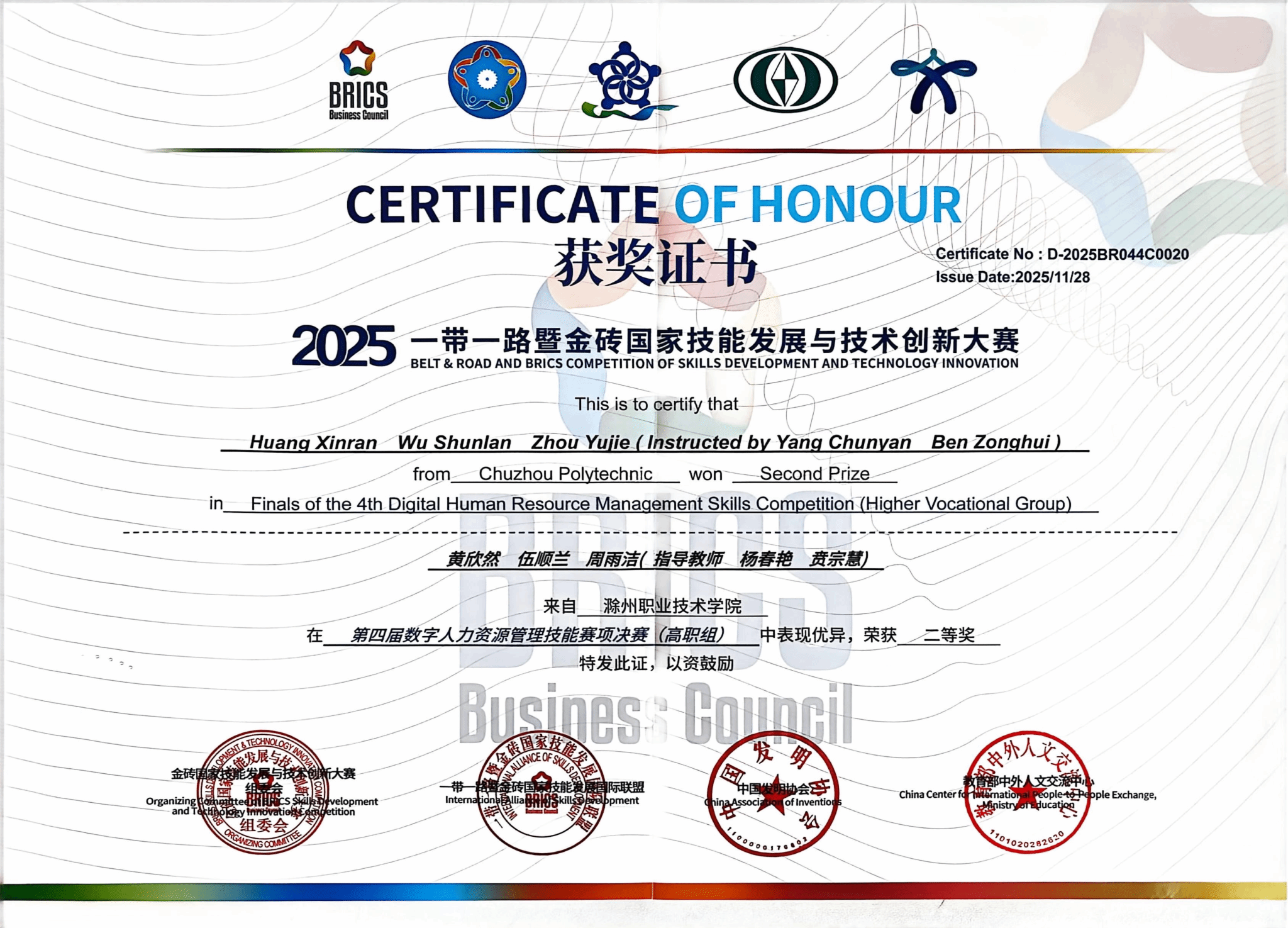 近日,2025“一带一路”暨金砖国家技能发展与技术创新大赛第四届数字人力资源管理技能赛项全国云端总决赛圆满落幕。我校管理学院23级工商企业管理班黄欣然、伍顺兰、周雨洁三位同学组成的参赛团队,凭借扎实的专业功底,从全国425支参赛队伍中脱颖而出,一举夺得高职组全国二等奖的优异成绩。杨春艳、贲宗慧老师荣获优秀指导教师,我校荣获优秀组织奖。