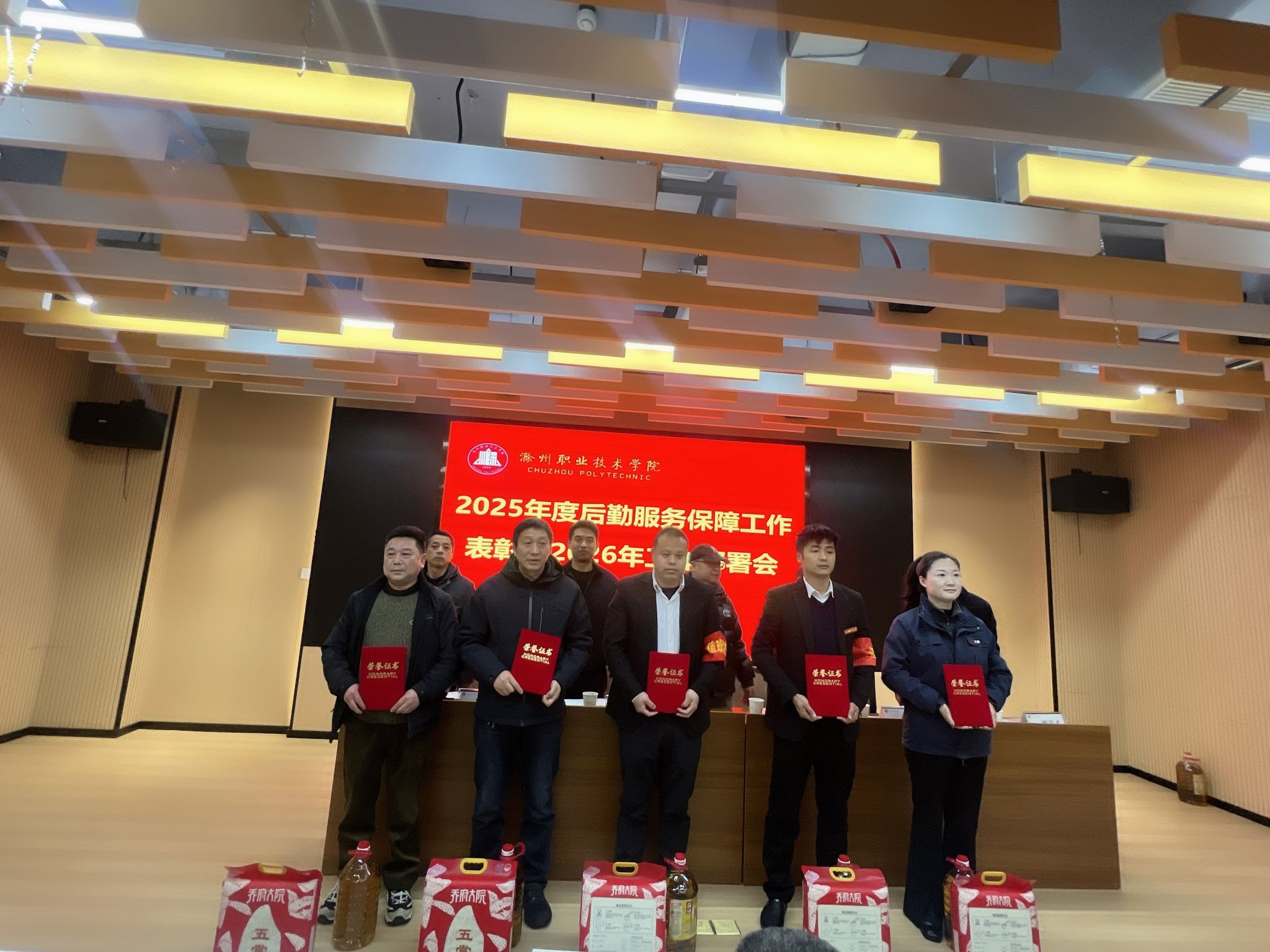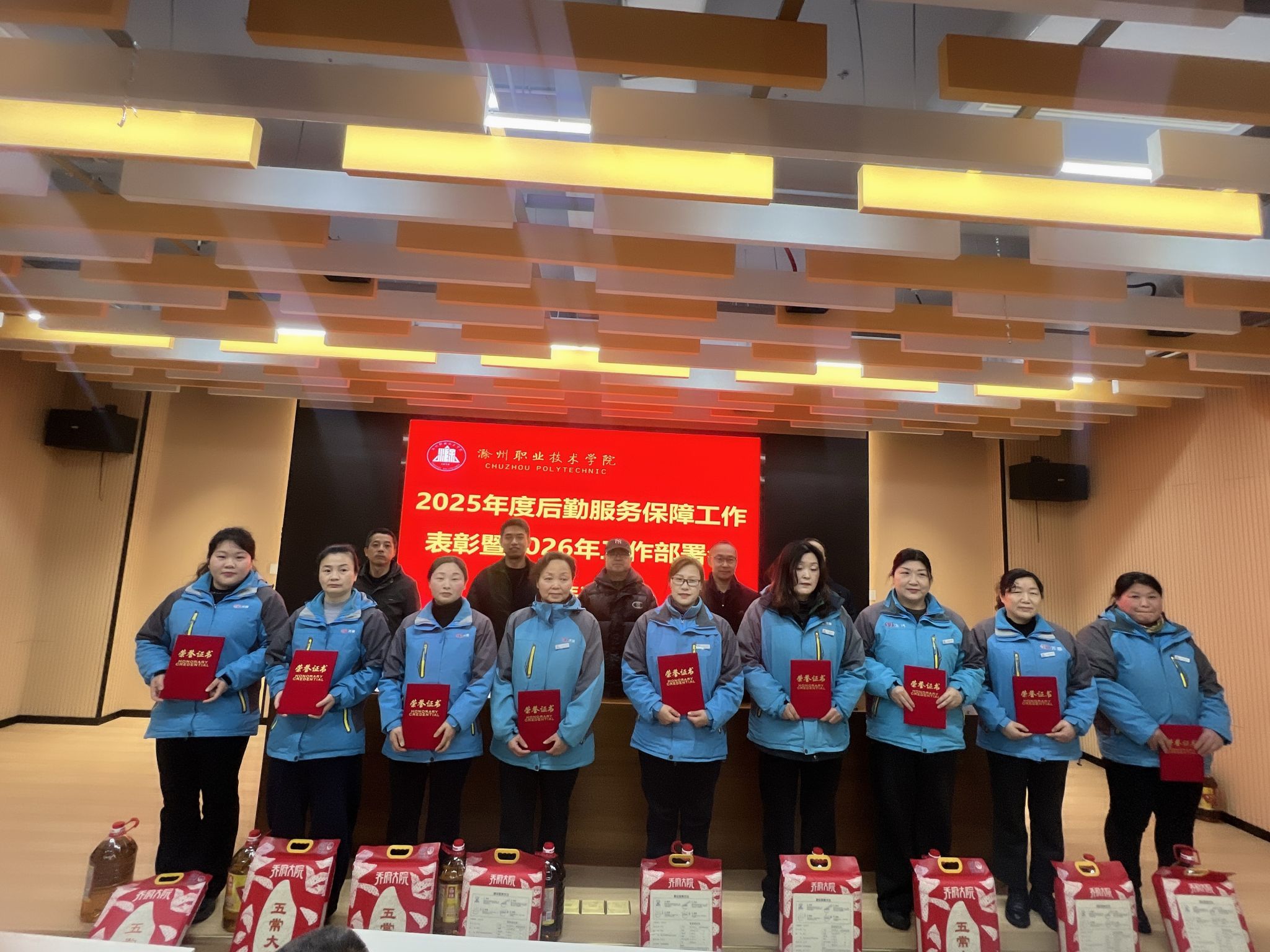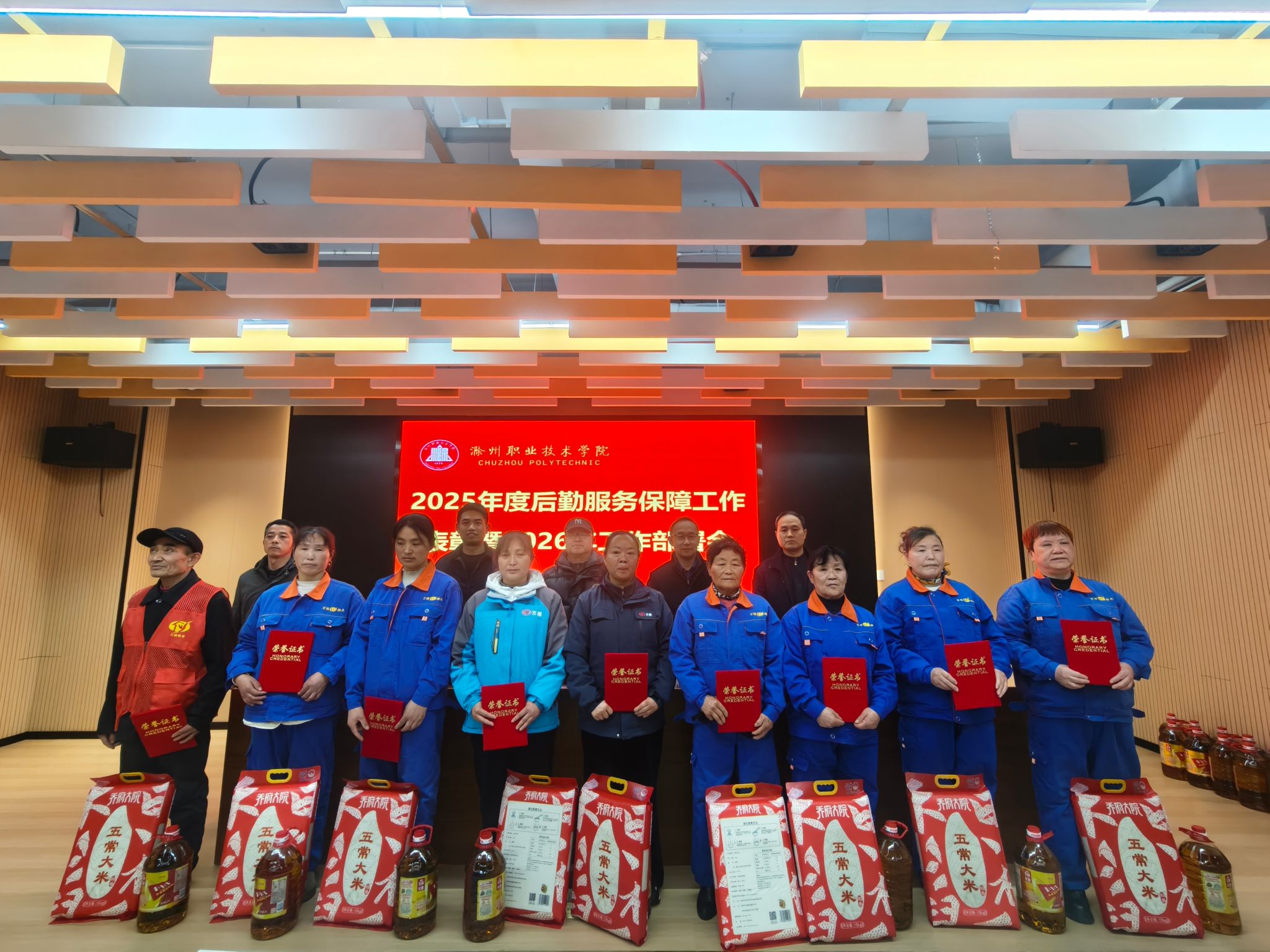 会上,后勤服务中心副主任陆凤林作2025年度后勤服务保障工作总结报告,全面回顾了过去一年后勤在制度建设、安全保障、服务育人、文化建设等方面的工作成效与不足。张军、甄帅分别宣读《关于表彰2025年度后勤服务保障“先进个人”的通报》《关于表彰2025年文明食堂红黑榜“优秀窗口”员工的通报》。活动现场为获奖的先进个人颁发了荣誉证书、奖品。