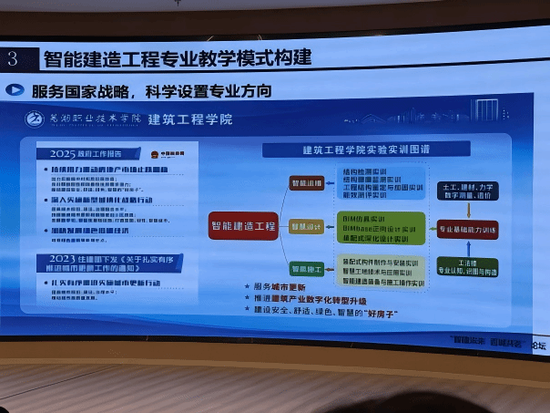 当日下午在主题报告环节,多位行业专家、院校学者围绕智能建造专业核心议题分享真知灼见。芜湖职业技术大学建筑工程学院院长方从严以《建筑业转型升级背景下智能建造工程专业教学模式的构建》为题,从行业转型需求出发,剖析了当前智能建造专业教学存在的痛点,提出“理论 + 仿真 + 实战”三维教学模式,为院校优化课程体系、创新教学方法提供了清晰框架;浙江同济科技职业学院建筑工程学院院长马知瑶聚焦《数智化转型背景下土木建筑大类教学能力比赛关键要素的多维解构与重塑策略》,结合赛事案例,拆解教学能力比赛中的核心能力要求,为教师提升教学竞赛水平、以赛促教提供了具体路径;黄山学院工程造价系主任黄剑则以该校为例,分享《工程造价专业数智化人才培养探索与实践》,详解了工程造价专业与数智化技术融合的课程设置、实践教学基地建设及校企合作模式,为同类专业转型提供了可借鉴的实践样本。