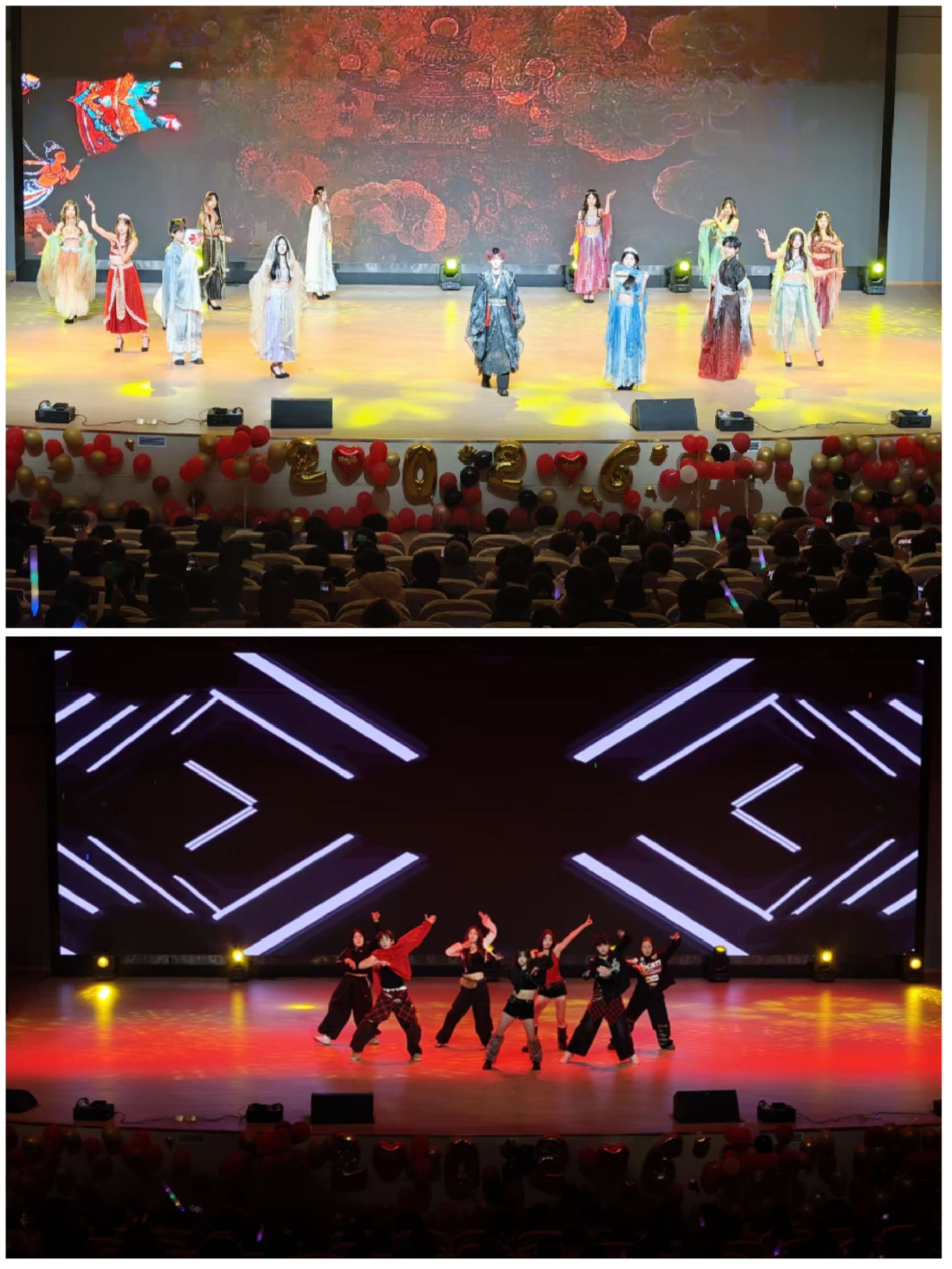 第一幕:灵蛇幻彩,青春律动。华美的T台走秀《一梦入敦煌》率先登场,带领观众穿越时空,领略丝路文明的璀璨。随后,活力四射的舞蹈《We Go Up》与激情澎湃的健美操《奔跑吧中国》相继上演,跳跃的音符与矫健的身姿交织,瞬间点燃了现场的热烈气氛,彰显出青年学子无限的青春动能。