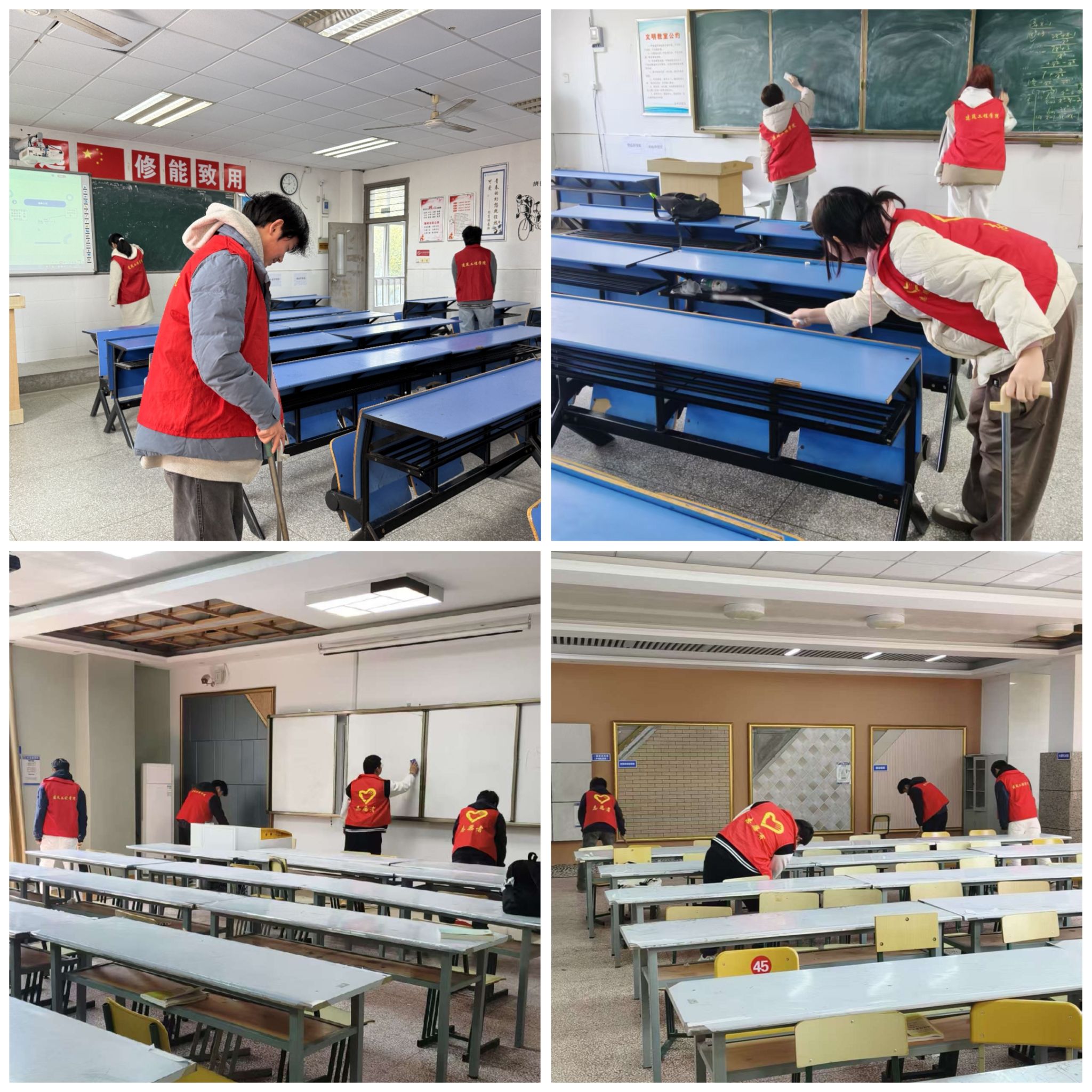 志愿者们身着志愿马甲,手持扫帚、抹布、黑板擦等清洁工具,分工明确、协作有序地打扫各个教室、实训馆。清扫过程中,学子们充分发扬不怕脏、不怕累的优良作风,干劲十足、默契配合。现场氛围热烈而温馨,处处洋溢着志愿服务的热情,展现出新时代学子积极向上的精神风貌。