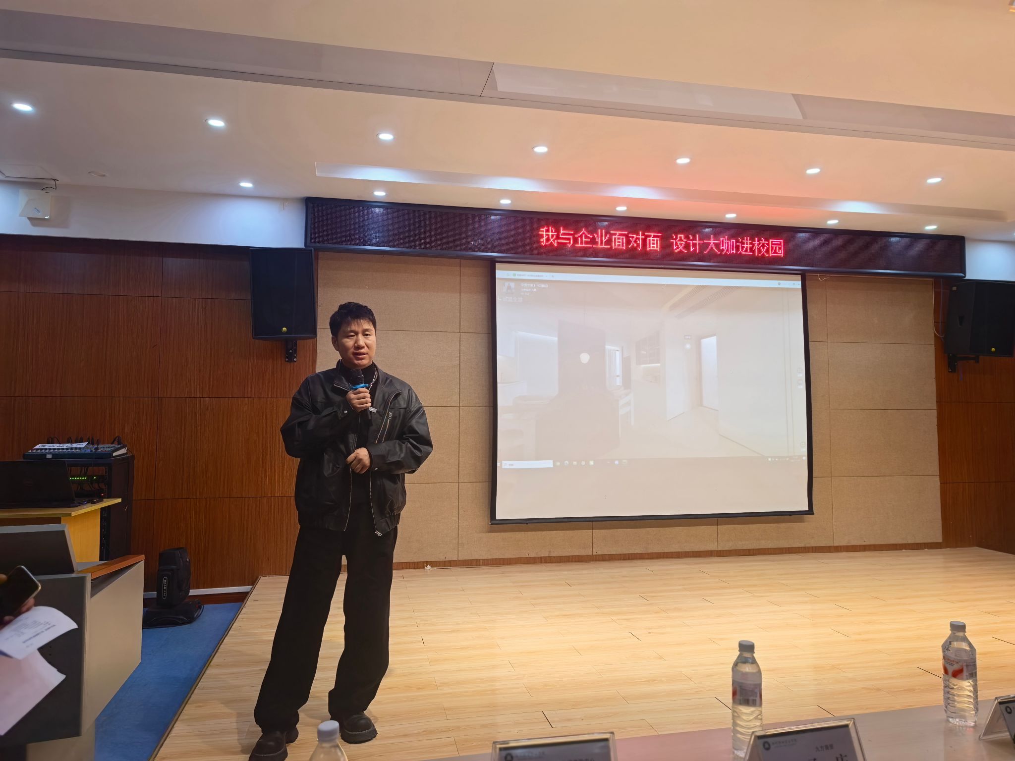 滁州市优秀青年企业家、滁州职业技术学院产业教授、滁州市久烁装饰设计有限公司创始人兼设计总监周刚首先登台,以“逆风前行 向阳而生”为主题分享了他的创业历程与设计哲学。通过展示多个标志性项目案例,他生动诠释了如何在市场挑战中把握机遇、在设计中坚持创新。“设计师的价值不在于模仿,而在于创造。在面对困难时,保持对设计的热爱和对美的追求,就是我们逆风前行的最大动力。”周刚还通过精心设计的互动问题——“你认为未来三年室内设计行业最大的变革会是什么?”引发同学们的深度思考,现场讨论热烈,思维火花不断碰撞。