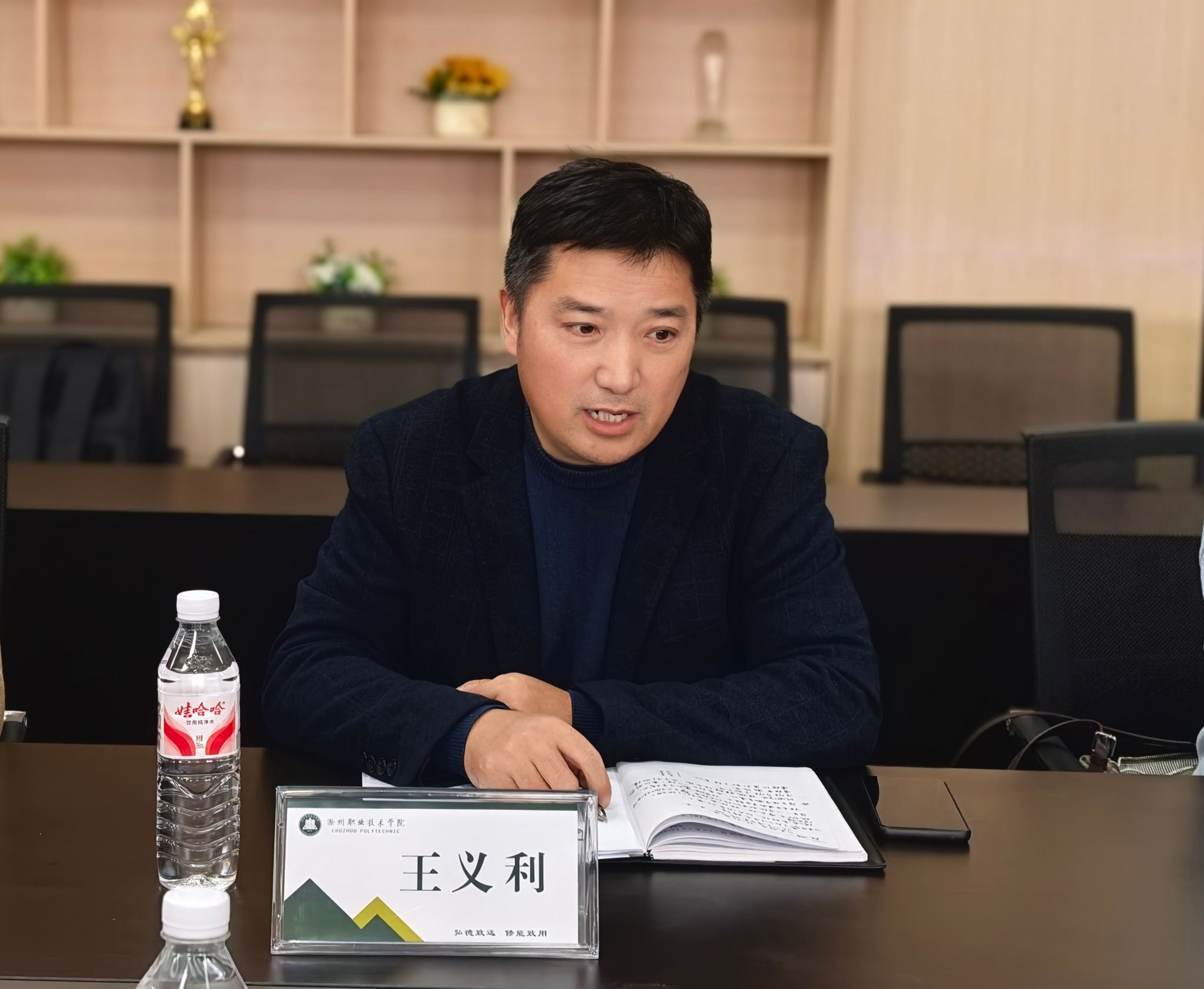 活动首环节在德馨楼302会议室举行。传媒与设计学院党总支书记王义利在开场致辞中,首先对各位企业家的到来表示热烈欢迎与衷心感谢。他指出,在当前经济结构调整和产业升级的大背景下,深化校企合作不仅是高等教育改革的重要方向,更是培养适应社会需要的高素质应用型人才的必由之路。“学院始终坚持以社会需求为导向,致力于打破校园与行业的壁垒。今天我们邀请企业专家走进校园,就是希望建立一种常态化、深层次的互动机制,让我们的教育更贴近市场脉搏,让学生的成长更符合时代期待。”
