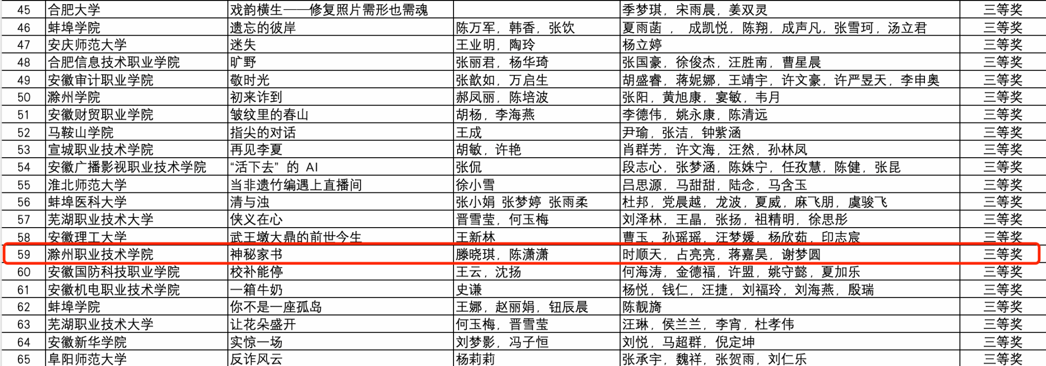 安徽省大学生微电影大赛是由安徽省教育厅主办的省级赛事,是全国高校传媒与影视相关专业的重要竞技平台与交流窗口。该赛事不区分本科组与专科组,实行混合竞赛,在此赛制下,我校学子凭借扎实的专业功底和卓越的创新能力脱颖而出,赢得评委的认可,斩获佳绩,更显难能可贵。