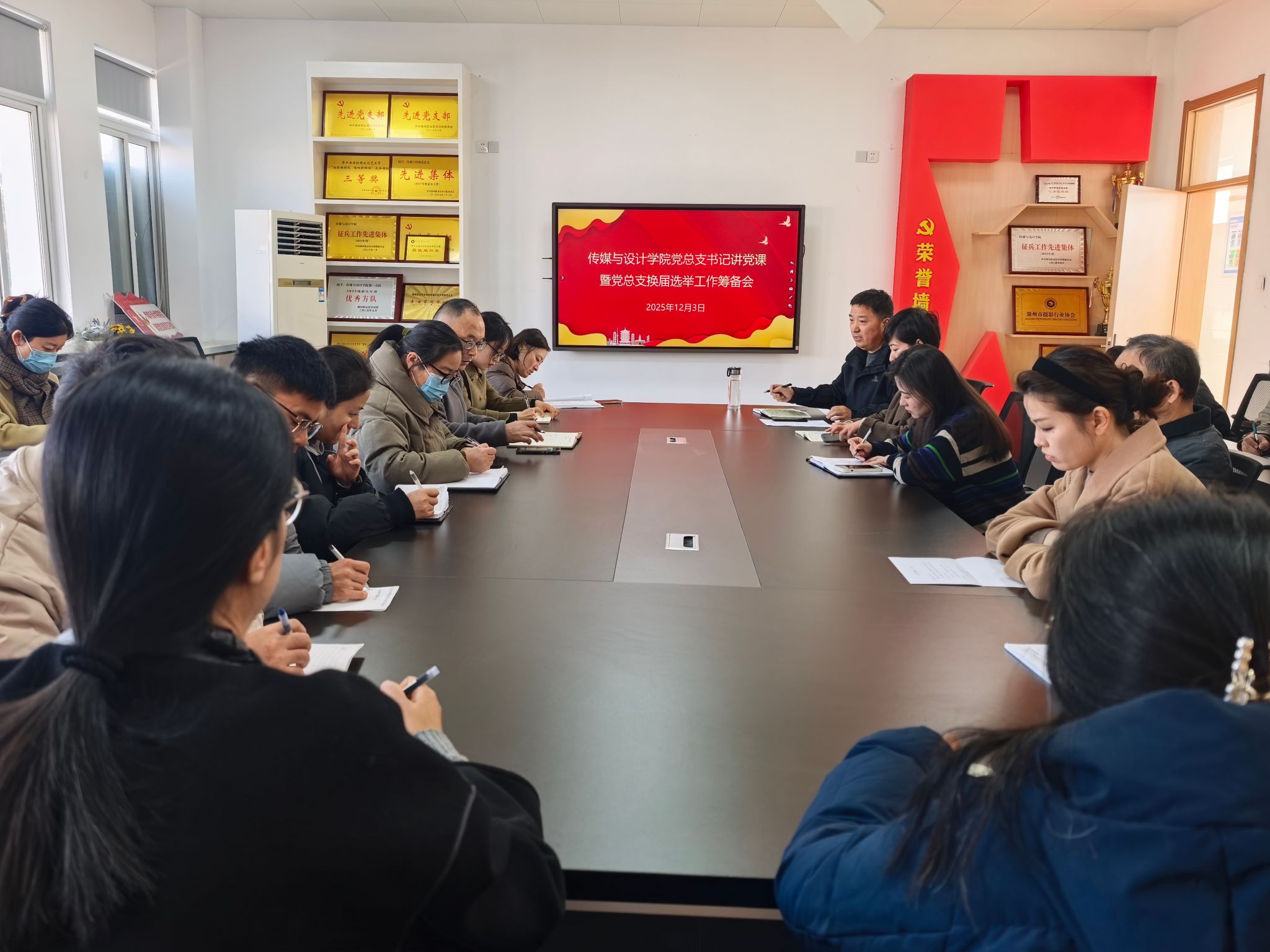 为进一步健全党内民主生活、推进党支部标准化规范化建设,全面提升基层党组织的凝聚力、战斗力与号召力,12月3日,传媒与设计学院党总支于德馨楼302会议室组织召开全体党员大会,同步推进党的二十届四中全会精神专题学习和党总支换届选举筹备部署,会议由学院党总支书记王义利主持。