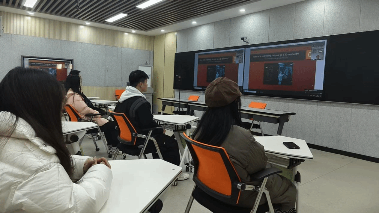 在交流互动环节,讲座现场气氛活跃。Kevin Ng.教授十分赞赏同学们对3D动画的学习热情和对AI的浓厚兴趣,并鼓励同学们在学习过程中充分发挥自己的积极主动性,把对动画的浓厚兴趣转化为学习的强大动力,尝试选择一个AI工具,把它整合进自己的下一个个人作品中。