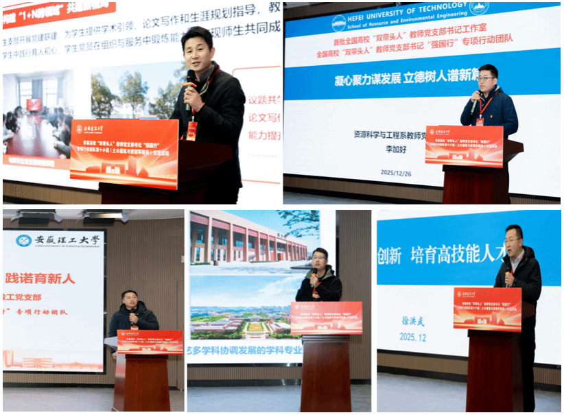 交流研讨环节,安徽建筑大学刘洋、合肥工业大学李加好、安徽理工大学李传明、安徽新华学院蒋亚龙、池州职业技术学院徐洪武等5位党支部书记分别结合党建工作实际,详细介绍了各支部在凝聚党员力量、推动学科建设、破解发展难题、培育专业人才、服务社会发展等方面的创新做法和显著成效,为各基层党支部深化党建与业务融合、提升支部建设水平和学科核心竞争力提供了丰富思考和有益借鉴。
