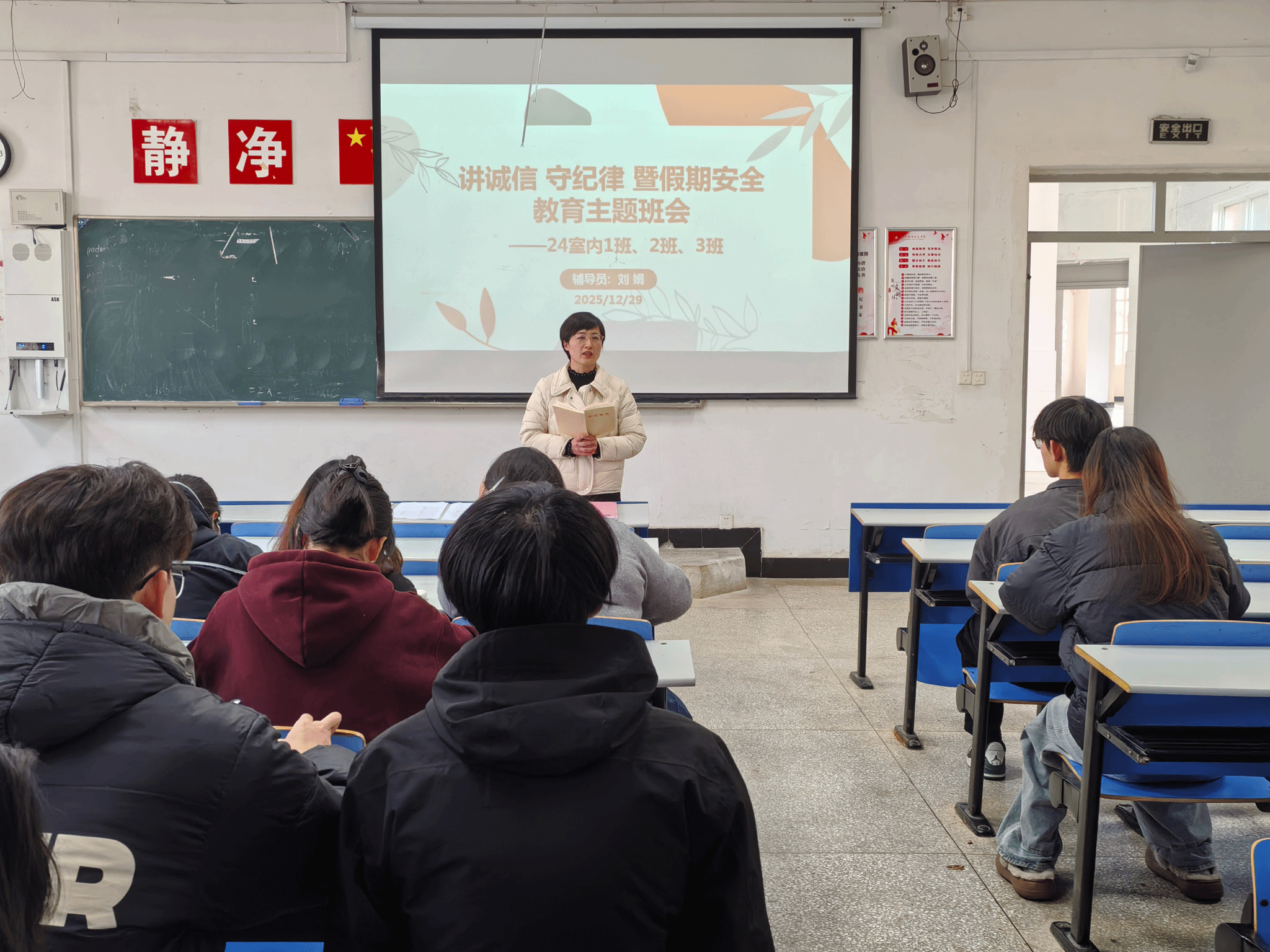 班会重点从两大核心主题展开。在元旦假期安全教育环节,辅导员围绕交通出行安全、消防安全、食品安全、用电安全等关键领域进行详细叮嘱,提醒学生出行时遵守交通规则,拒绝乘坐无牌无证、超载超员等不安全车辆;居家或外出期间注意用火用电规范,远离易燃易爆危险物品;合理规划饮食,避免食用不洁食品;同时强调要提高网络安全防范意识,警惕网络诈骗、网络谣言等风险,保护个人财产安全与信息安全。此外,辅导员还着重提醒学生做好个人健康防护,关注冬季常见呼吸道疾病预防,合理安排作息时间,坚持适度体育锻炼,保持良好生活习惯,度过安全、健康、充实的假期。