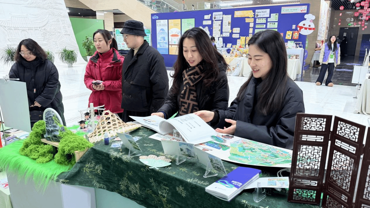 在非遗类文创展区,针对以“亭城二十四:亭城时序·古法染遗”为核心元素的设计作品,李雯雯主任结合该二十四节气与滁州地标特色符号的深厚渊源,为琅琊山管委会负责人进行了全方位解说,引发其对地方非遗文创的兴趣;对于融入滁州本土特色元素的茶饮“山水之间,自然很甜”的这一文创作品,琅琊山工作人员从形态精准呈现与文化识别度提升的角度,给出了切实可行的优化方案。在文旅体验方案展区,学生围绕江淮分水岭风景道策划的“星漫江淮”“谜游江淮”等作品,均得到了专业点评。戴莺副主任从动线规划合理性、内容衔接流畅性、运营落地可行性等关键维度展开研讨,提供了操作性极强的指导意见。随后,进入放映厅观看动漫制作技术专业的动画作品,如《光影旧巷》《醉翁之始》等动画短片,为宣传滁州文化贡献了力量。