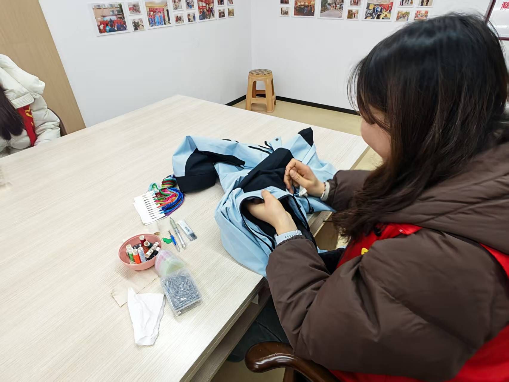 活动当天,志愿者们分别在社区内拉起了醒目的红色横幅,并带着专业的缝纫工具和针线盒早早地布置好了临时服务点,为居民开展旧衣物改造设计和缝补活动。社区居民带着家中需要修改的衣物、掉落的纽扣或是破损的床单陆续前来。