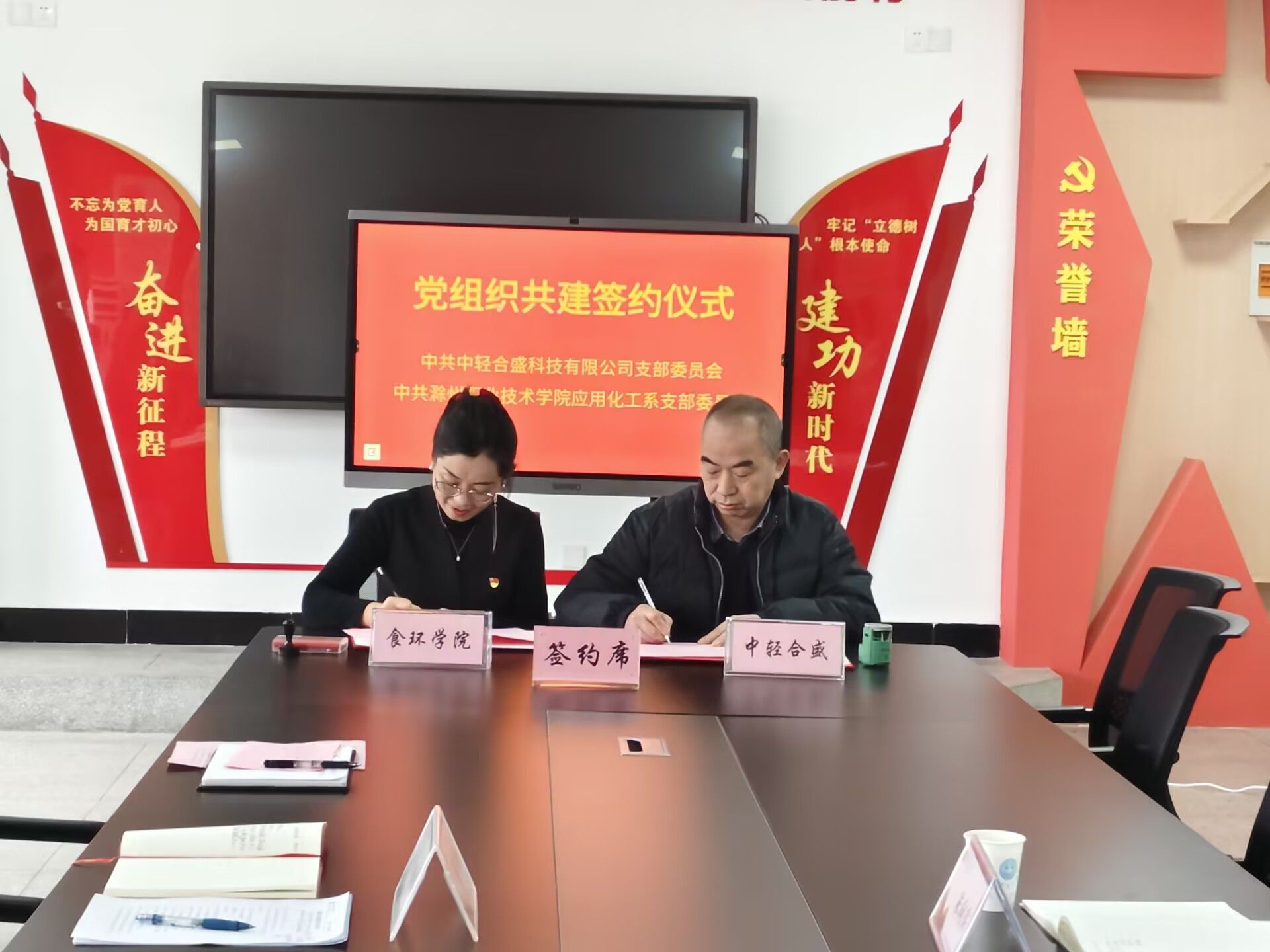 为深入贯彻落实新时代党的建设总要求,推动基层党组织建设提质增效,深化产教融合、校企合作,12月24日上午,食品与环境工程学院应用化工系党支部与中轻合盛科技有限公司党支部共建签约仪式在致善楼2317会议室举行。双方党组织代表齐聚一堂,共同见证并签署了党组织共建协议。