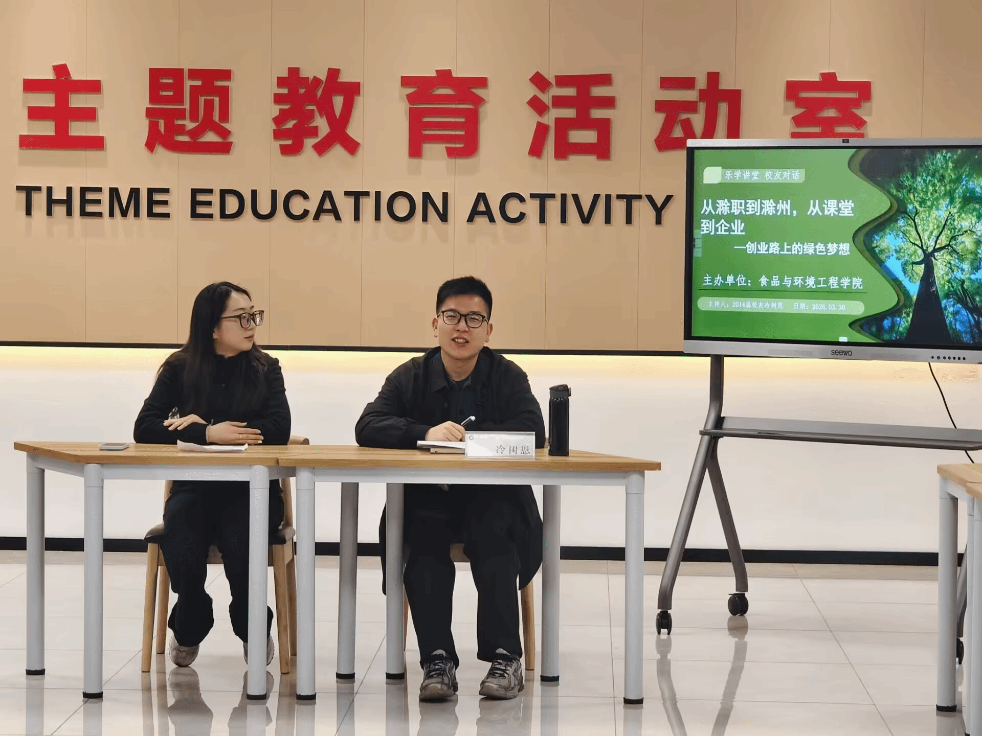 3月30日晚,食环学院第十一期“乐学讲堂·校友对话”活动在“一站式”学生社区主题教育活动室举行。活动特邀2014届园林技术专业优秀校友冷树恩返校,围绕“创业路上的绿色梦想”与2025级各班学生代表分享成长经历与创业心得。