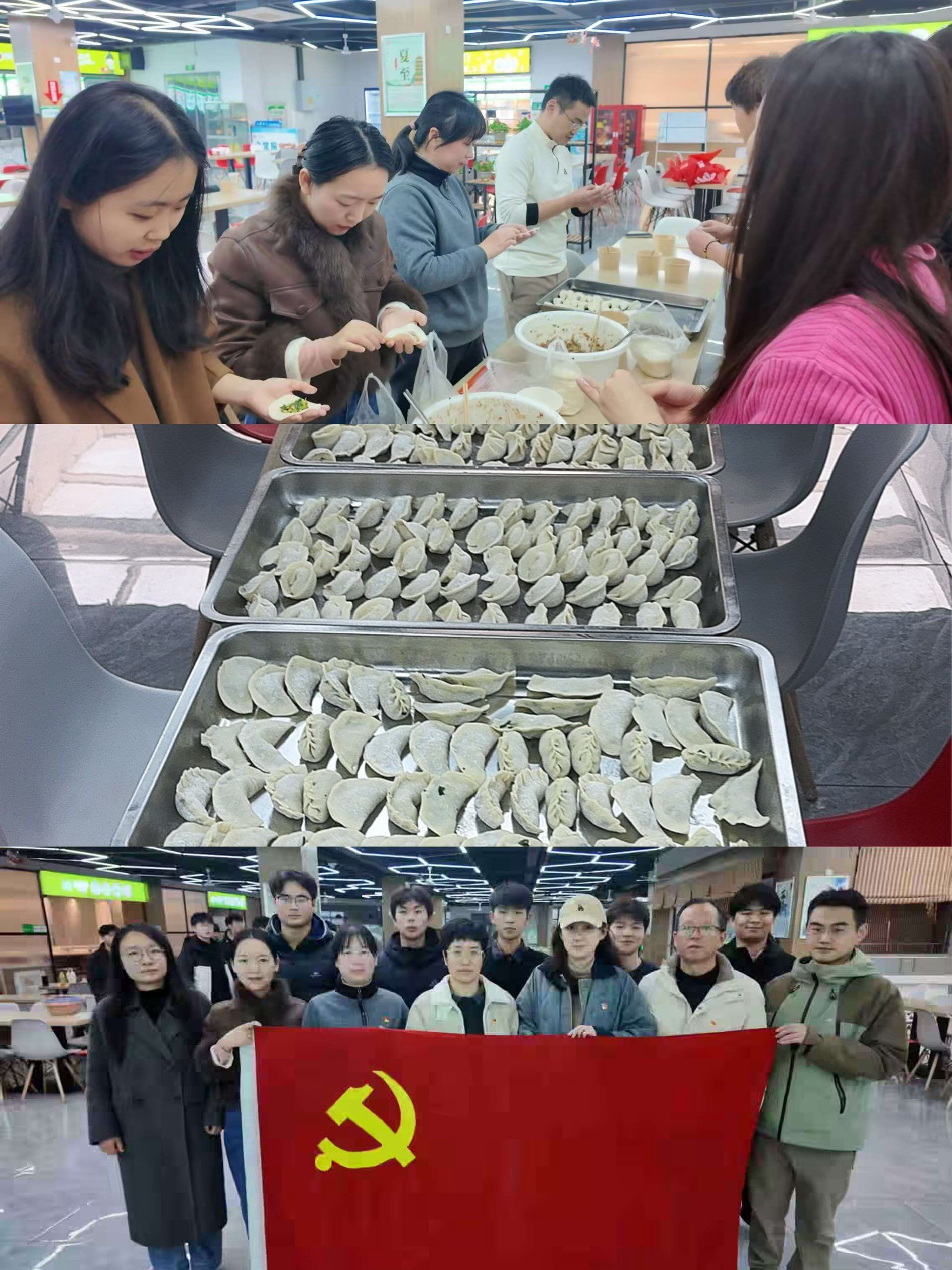 活动现场暖意融融,支部党员与学生们齐聚一堂,分工协作、默契配合。揉面、擀皮、包馅的环节有条不紊,手法娴熟的党员手把手指导学生,形态各异的饺子摆满托盘,欢声笑语间尽显其乐融融的氛围。待饺子煮熟出锅,大家围坐分享美食,畅谈学习生活感悟,在热气腾腾的烟火气中拉近了彼此距离。