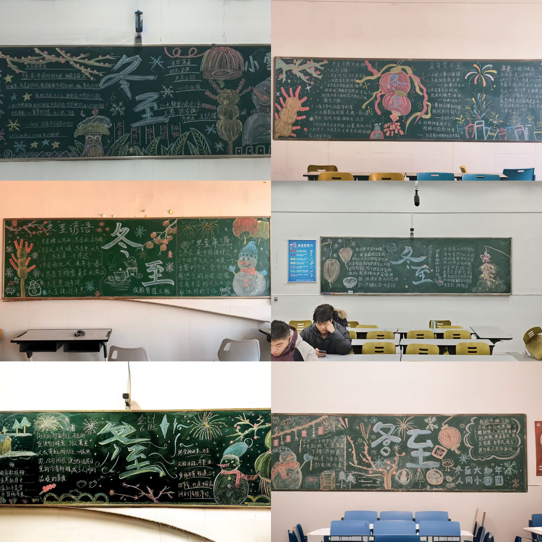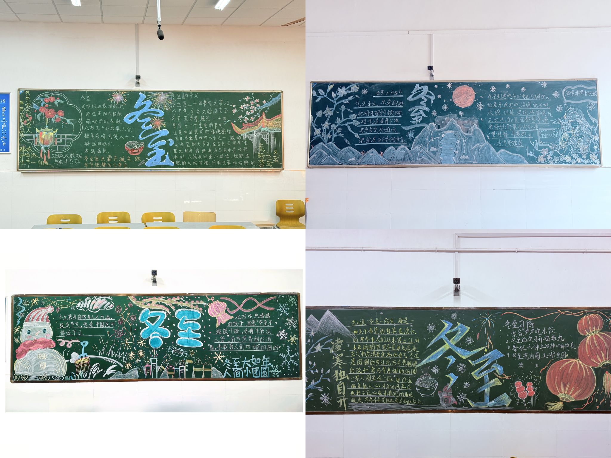 活动开展期间,各班级紧扣主题,巧思匠心打造独具特色的黑板报。每一块板报都以丰厚详实的冬至民俗资料为底色,以新颖别致的创意架构版面,以鲜活灵动的节气图案与真挚恳切的文案点睛,生动彰显传统节日独有的文化魅力与源远流长的深厚内涵。
