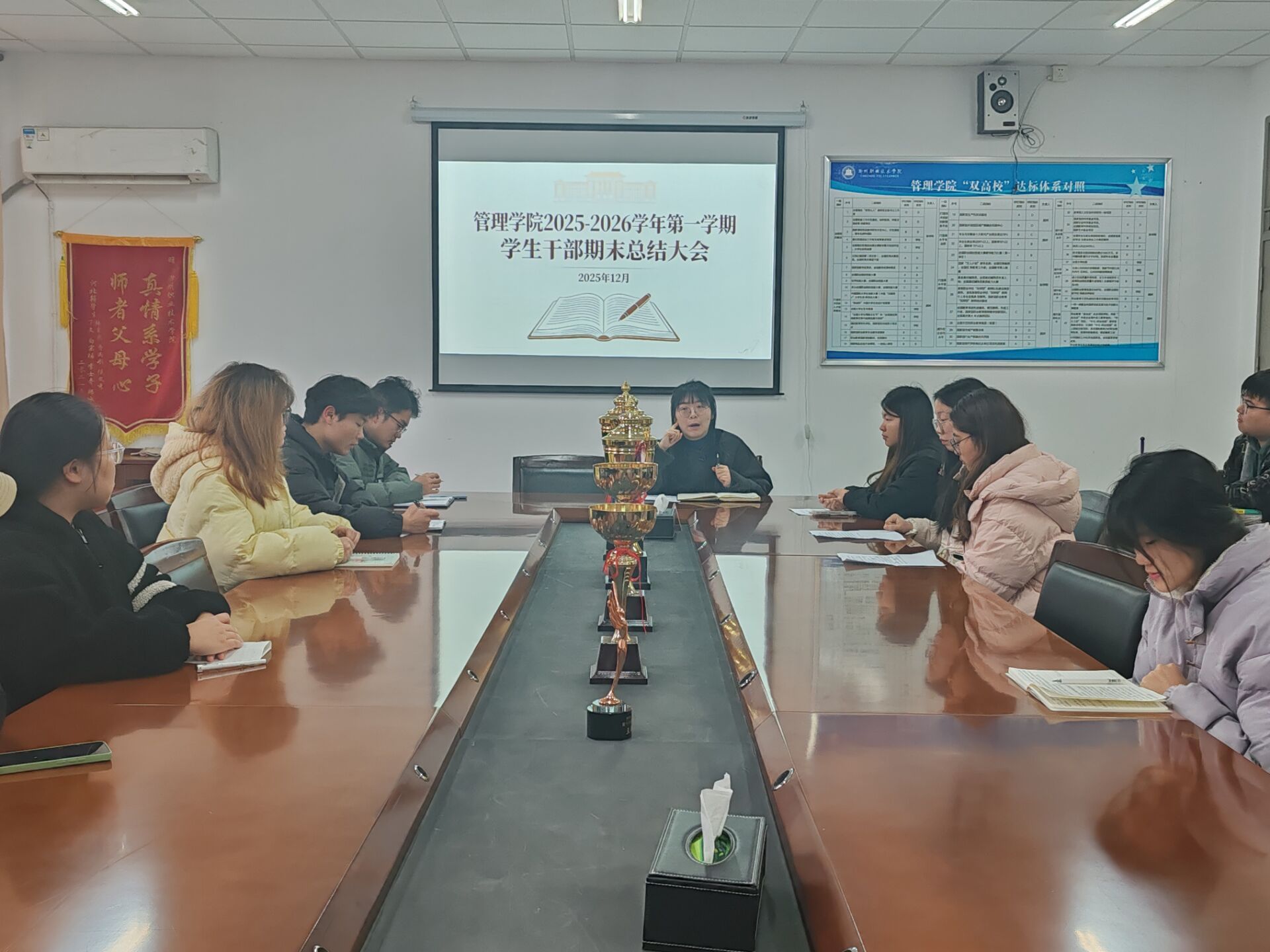 2025年12月30日,管理学院于致真楼1405教室召开2025-2026学年第一学期学生干部期末总结大会,此次会议由团总支书记袁一主持,辅导员刘宝睿及团学组织学生干部参加。