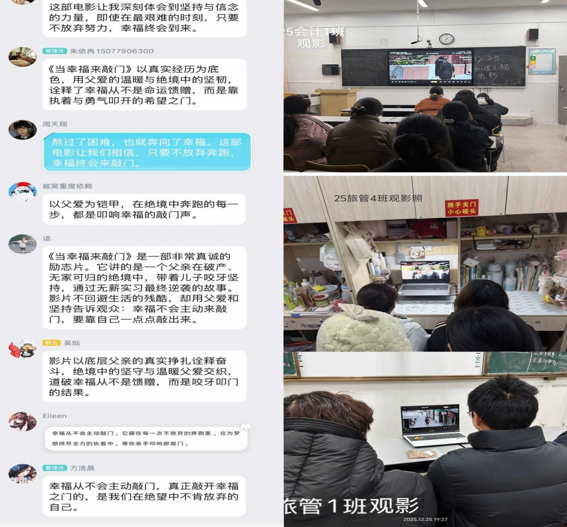 12月12日-25日期间,学院以“寻找内心的力量”为主题,组织学生观看经典心理题材电影《当幸福来敲门》。2025级学生以班级为单位集中观看并开展交流,2024级、2023级学生自主观看。影片中主人公面对困境的勇气与坚持,深深触动了同学们的心灵。观影结束后,各班级组织在群内分享感悟,同学们纷纷表示,电影不仅带来情感上的共鸣,更启发他们在面对压力与挑战时,学会接纳、坚持与超越,汲取前行力量。