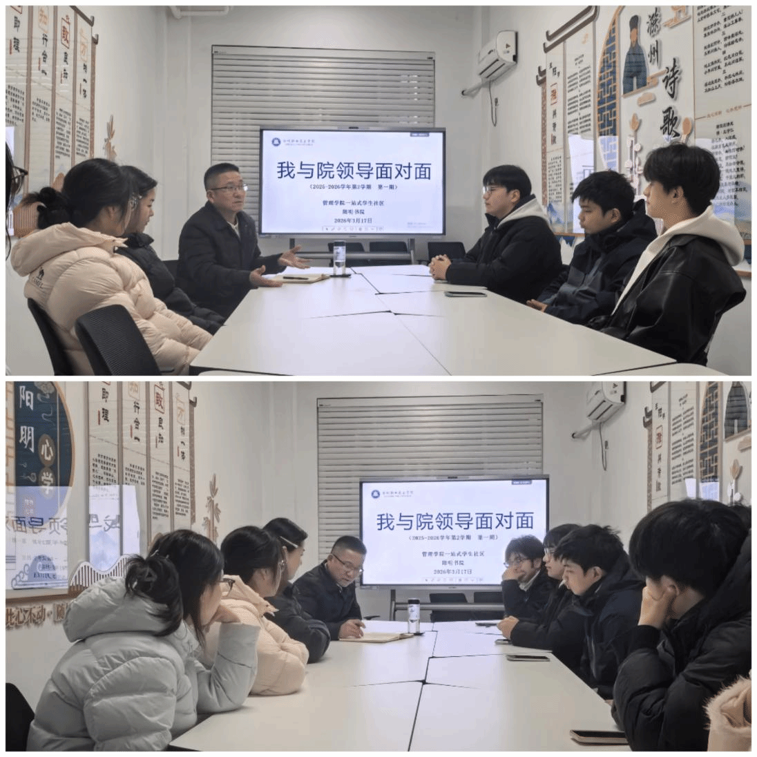 为了畅通学生诉求渠道,实地了解学生近期诉求。3月17日下午,管理学院在13号楼阳明书院召开“我与院领导面对面”专题座谈会。会议由学院党总支副书记杨之武主持,各年级在校生代表与专职辅导员参会。座谈会聚焦学生管理日常工作,学生代表围绕住宿环境优化、校园文明建设、快递站搬迁等具体问题展开交流,现场氛围热烈坦诚。