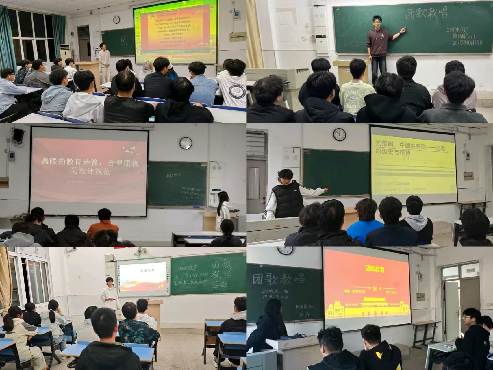本次主题活动以教唱、学唱中国共产主义青年团团歌《光荣啊,中国共青团》为核心内容。各班团支书精心准备,通过介绍团歌的创作背景、歌词内涵及其所蕴含的崇高精神,引导同学们深刻理解团歌所代表的青春理想与时代担当。在教唱环节中,团支书们耐心示范,逐句教授,同学们神情专注,跟唱认真,用饱满的热情和昂扬的声调反复练习,力求准确掌握旋律与歌词。