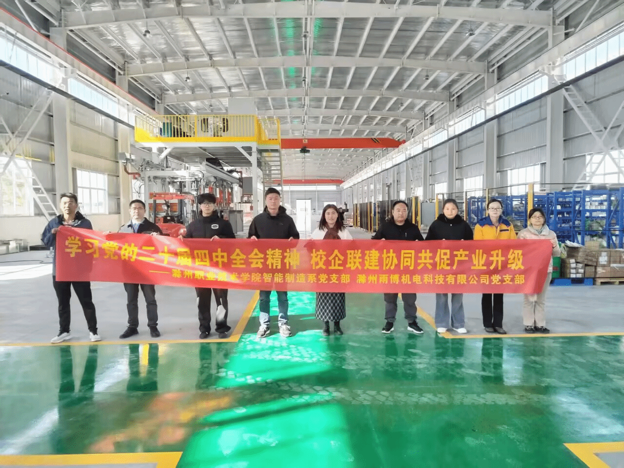 签约仪式后,双方围绕党的二十届四中全会精神学习体会、联建项目落地细节展开深入研讨。与会党员代表纷纷表示,将以此次联建为纽带,主动发挥先锋模范作用,在教学科研、生产实践一线担当作为,推动校企合作从“业务对接”向“组织共建、事业共促” 深度转型,双方约定将以共读共学、联合调研等形式,推动全会精神学习走深走实。最后,在滁州雨博机电科技有限公司负责人的带领下,智能制造系一行实地参观了企业生产车间、技术研发中心和员工实训基地,详细了解企业生产流程、核心技术应用及岗位设置标准。