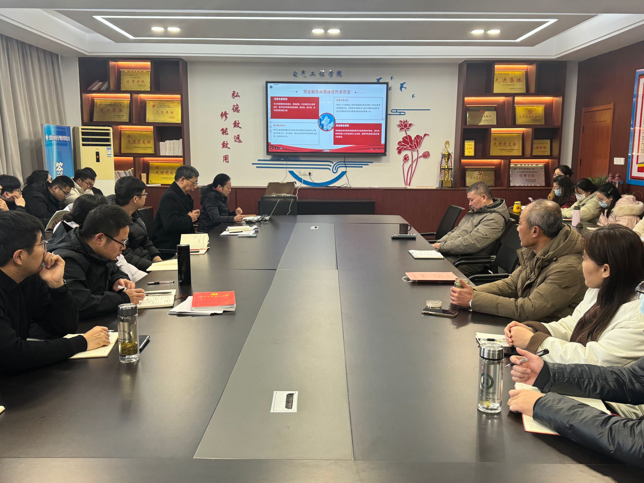12月24日下午,电气工程学院党总支书记薛天飞在5304会议室讲授题为《党业融合强根基 担当奋进筑新程》主题党课,电气工程学院全体教职工参加。