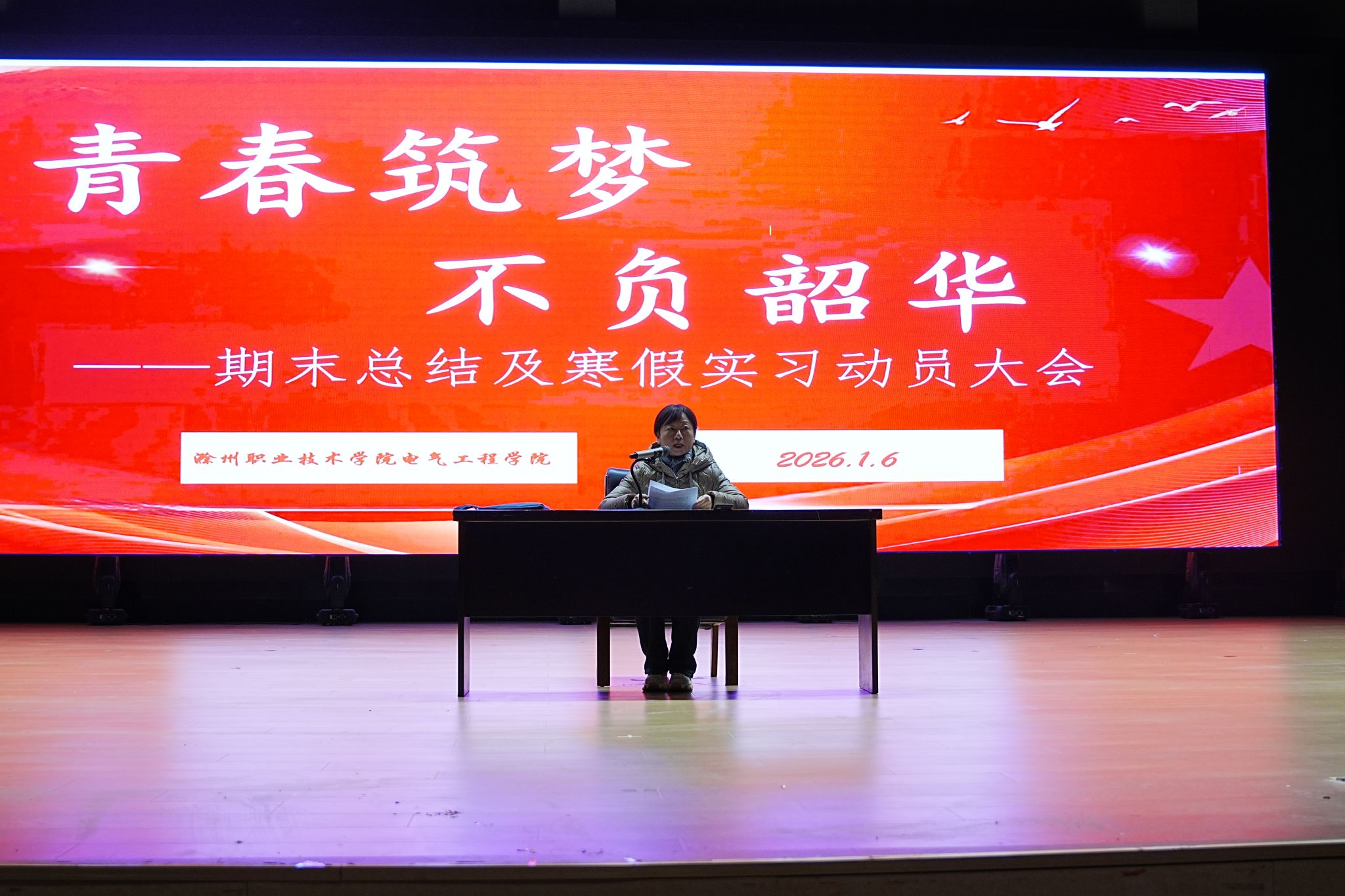为总结学期成果、部署寒假实习工作,电气工程学院于1月6日晚19时在学校大礼堂举行2025-2026学年第一学期期末总结暨寒假实习动员大会。学院党总支书记薛天飞给大家作总结动员讲话,2024级全体学生参加了本次大会。
