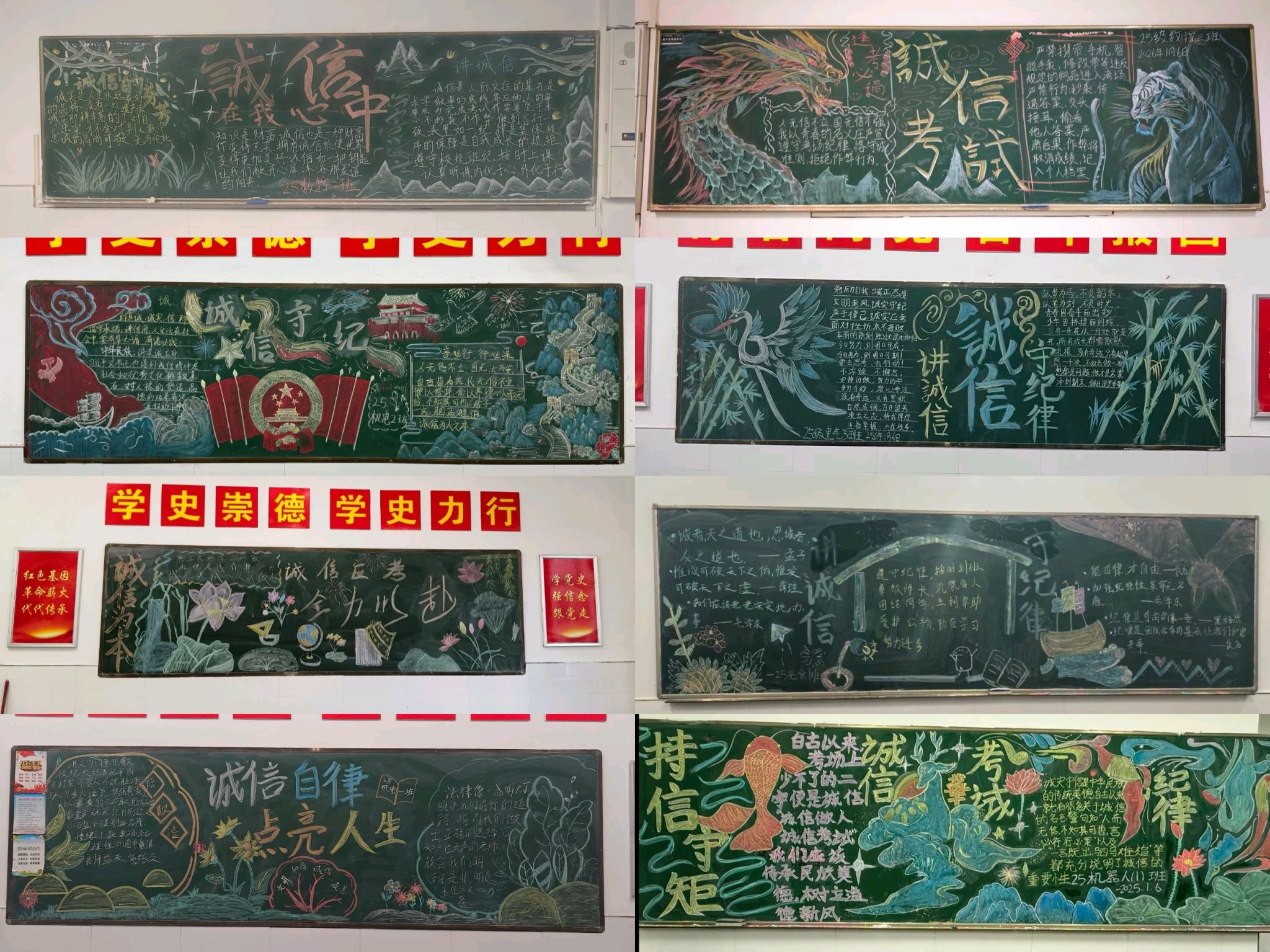 与此同时,主题板报征集活动也同步火热进行。各班级充分发挥创造力,精心设计制作了以诚信考试为主题的板报。板报内容紧扣主题,不仅清晰地展现了考试纪律要求、违纪处理办法等关键信息,更通过名言警句、漫画插图、倡议书等多种形式,生动形象地弘扬了诚实守信的传统美德,鞭挞了考试舞弊的不良行为,在潜移默化中强化了学生的规则意识和自律精神。