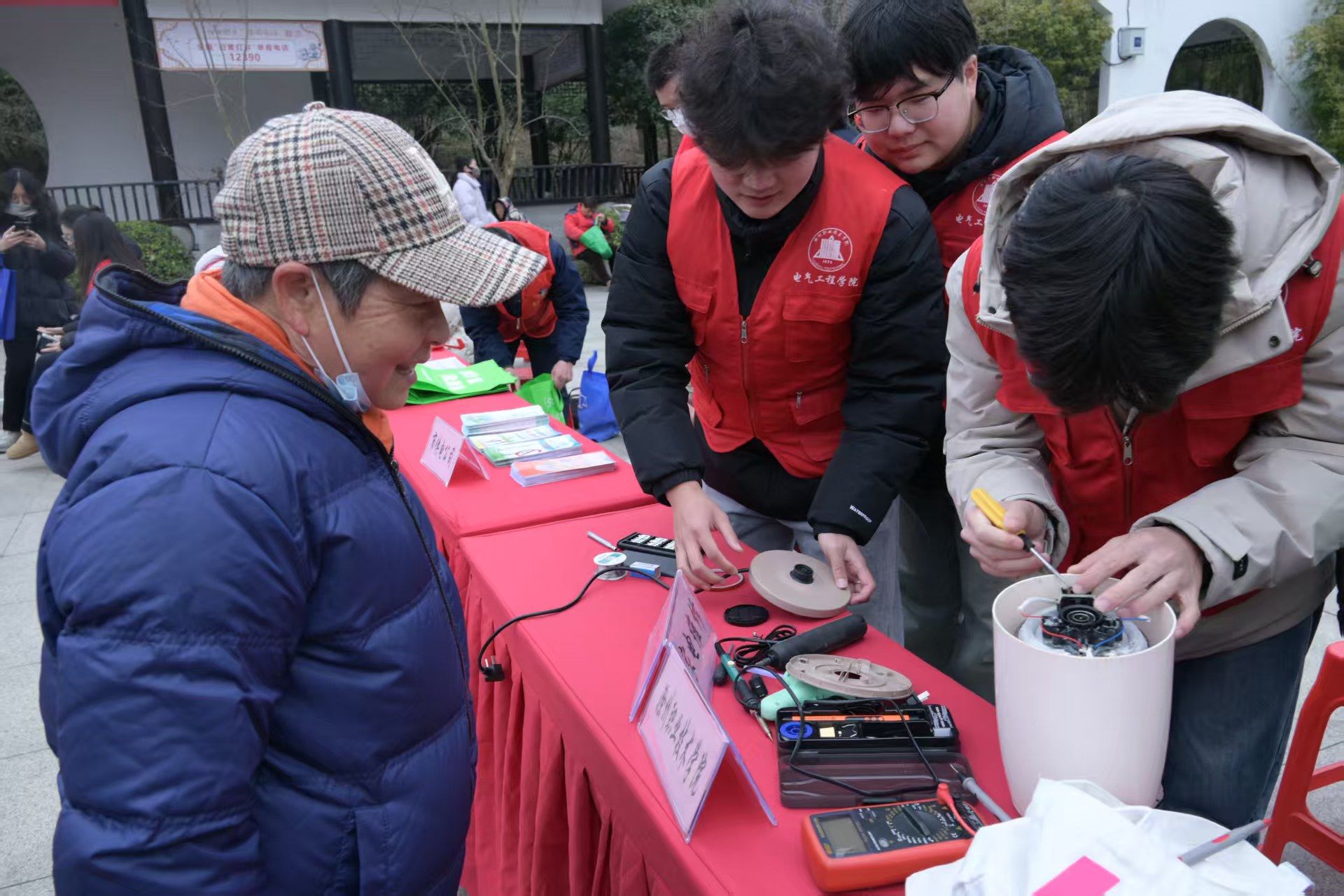 上午九时许,龙池社区广场上格外热闹。电气工程学院的志愿者们刚拉起横幅、摆好维修工具,就有不少居民带着家中“罢工”的电风扇、电饭煲、热水壶等小家电前来求助。志愿者们迅速进入状态,热情接待每一位居民,仔细询问故障情况,并认真做好登记。活动现场,志愿者们分工明确,配合默契。检测、拆卸、焊接、调试……一系列操作行云流水。面对复杂的电路问题,同学们或查阅资料,或相互探讨,力求为居民解决实际问题。