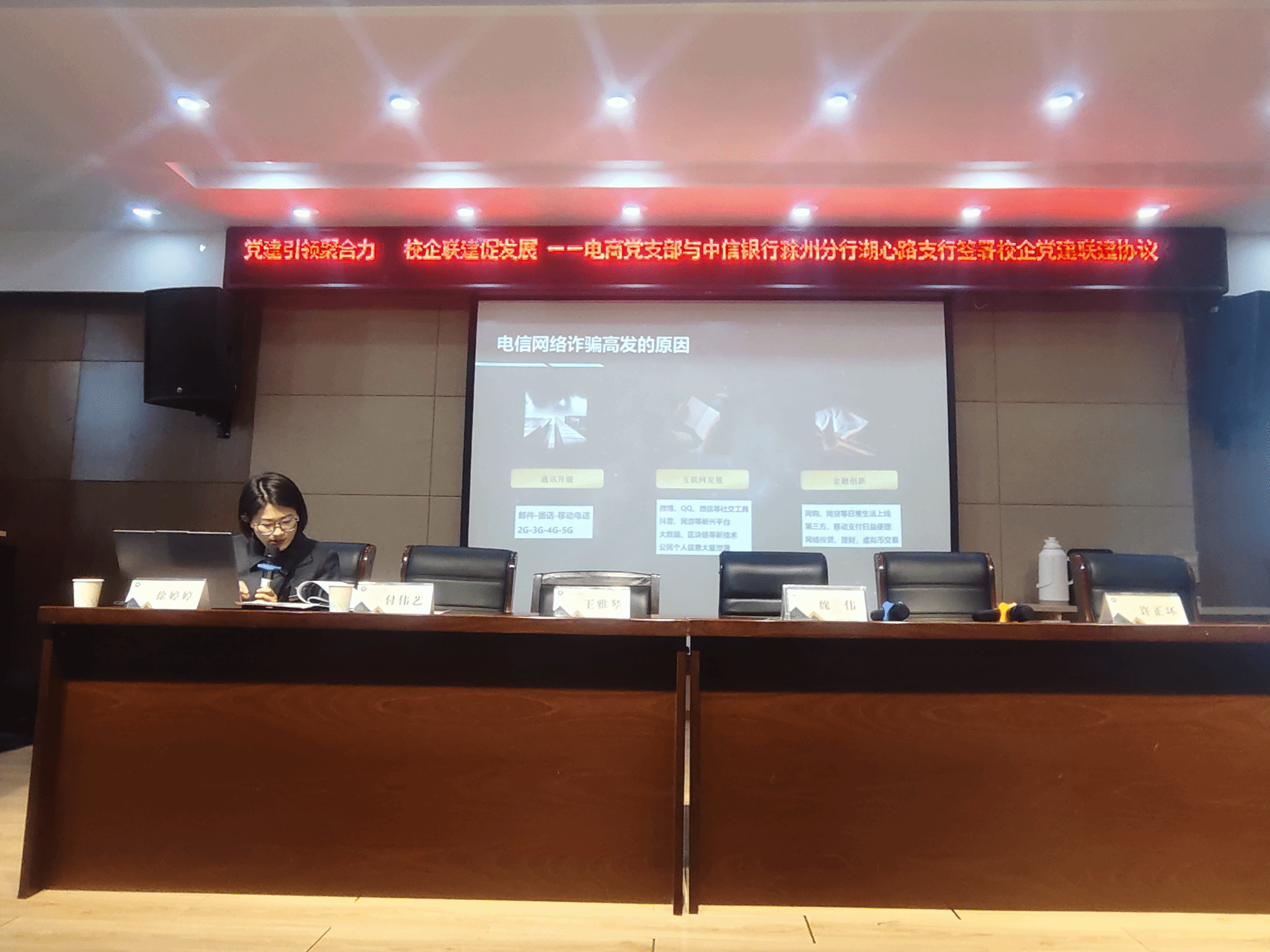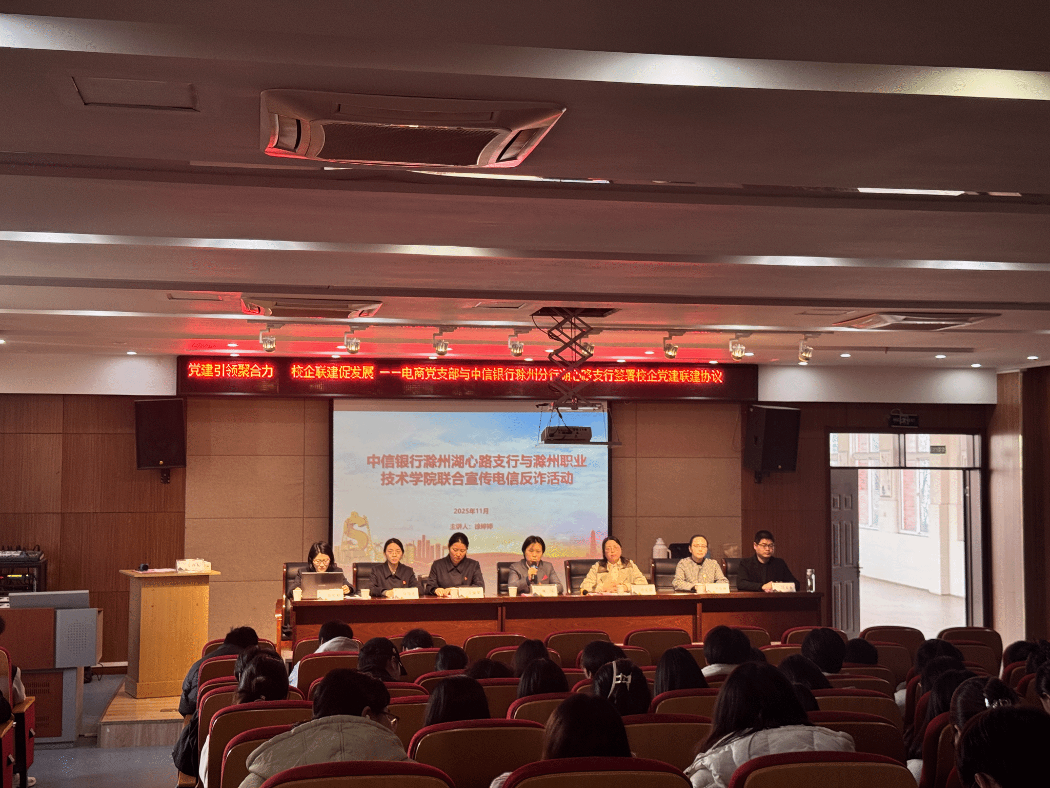 2025年11月26日下午,滁州职业技术学院商学院电商党支部与中信银行滁州分行湖心路支行联合开展的“反诈进校园・党建护成长”党建联建活动——校园反诈知识宣传讲座,在南阶203教室顺利举行。校企双方代表及2025级电子商务系学生共百余人齐聚现场,共同参与这场兼具实用性与教育意义的反诈宣传活动。中信银行滁州分行湖心路支行行长、党支部书记魏伟,理财经理徐婷婷等银行代表,与滁州职业技术学院商学院副院长、电商党支部书记许正环,支部组织委员李有莉、宣传委员吕玉龙及支部党员共同出席活动,为校银党建联建与反诈宣传工作筑牢坚实基础。