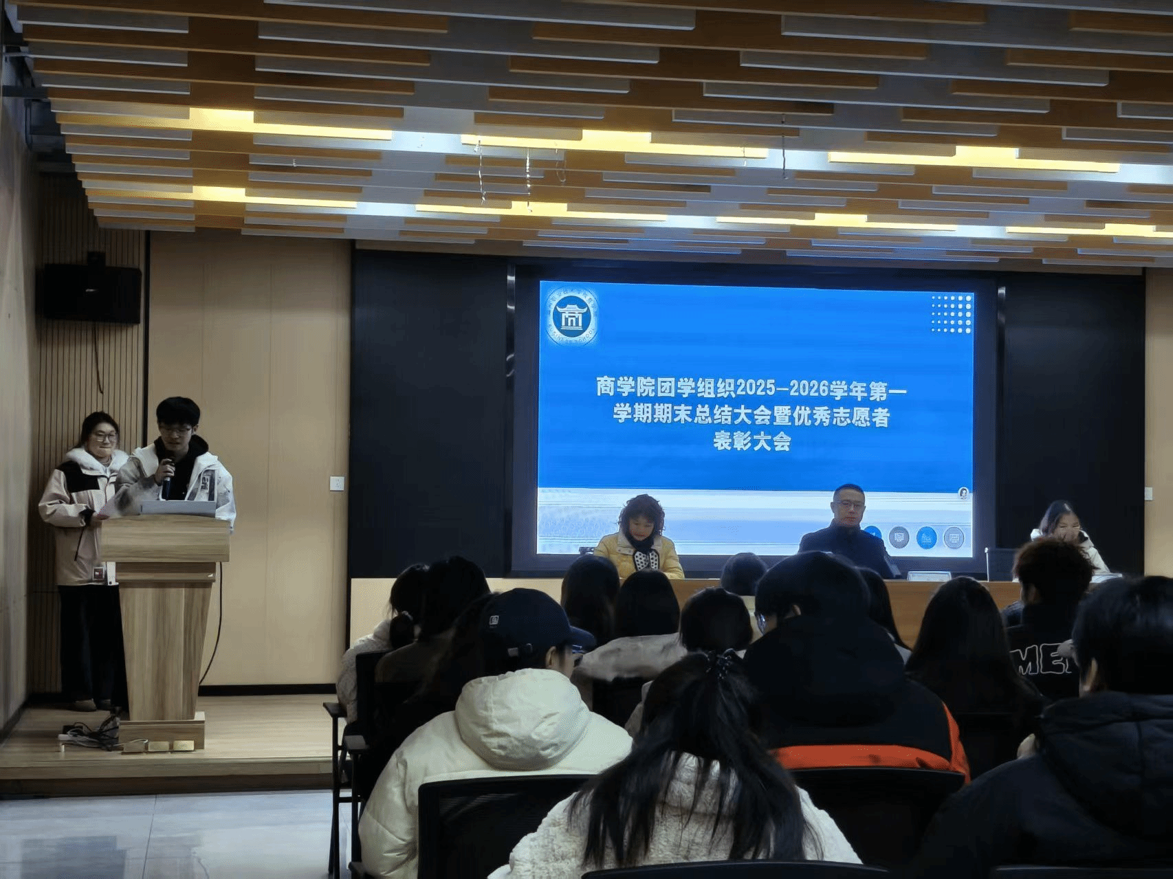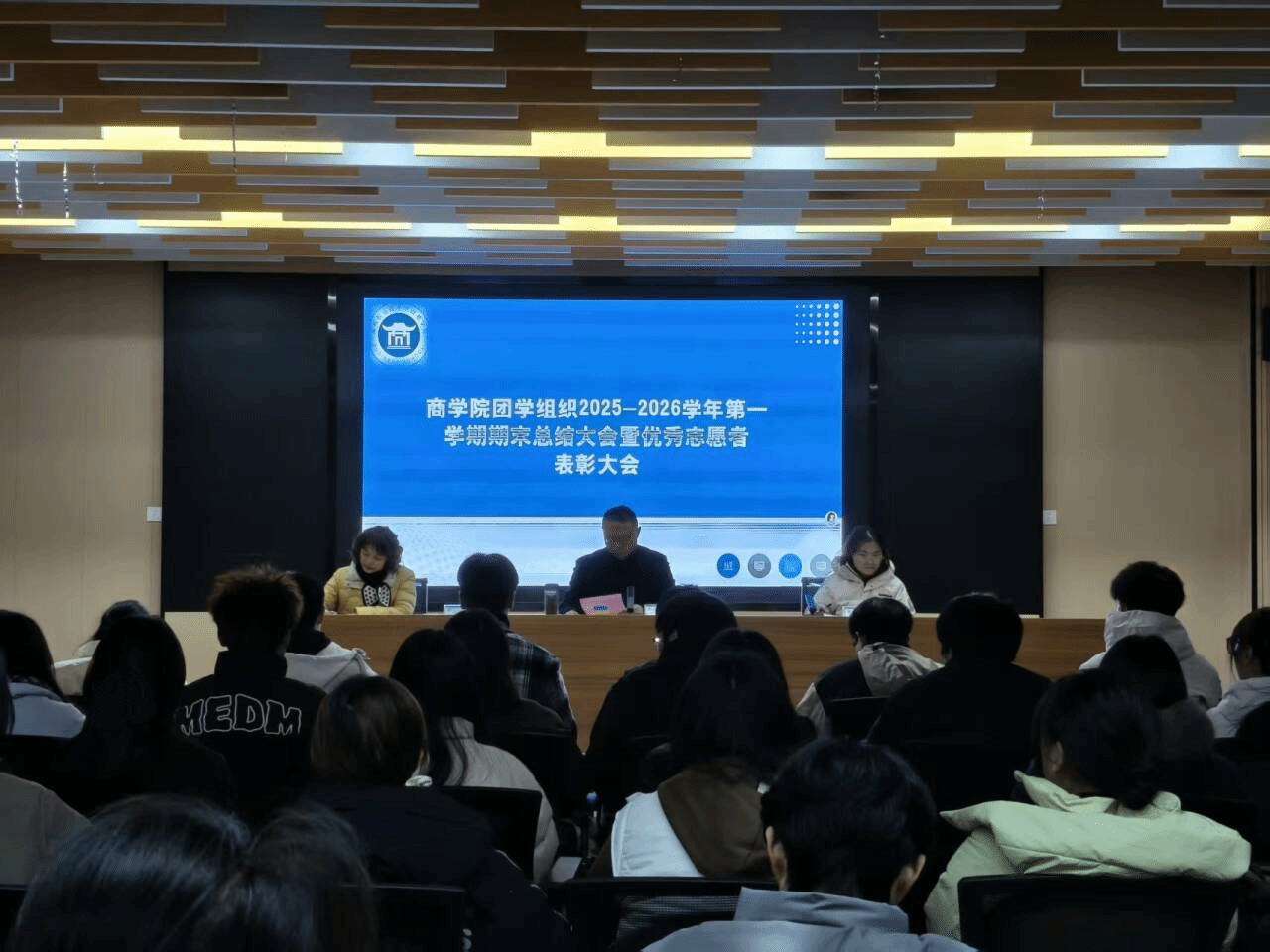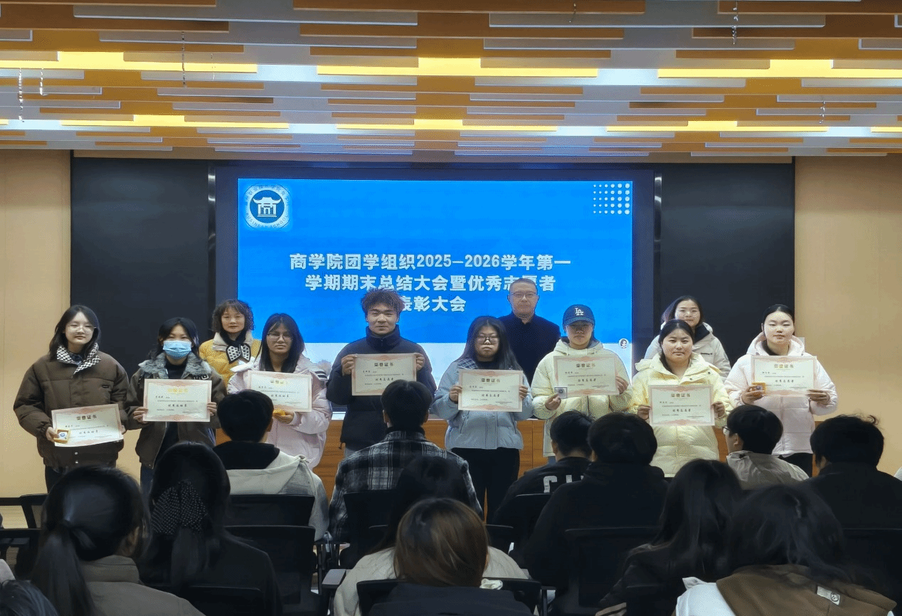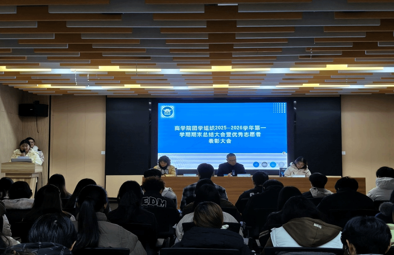 为全面总结2025-2026学年第一学期团学工作成果,表彰先进典型,凝聚团学组织力量,2026年1月8日,商学院团总支在一站式学生社区召开2025-2026学年第一学期期末总结大会暨优秀志愿者表彰大会。校党委委员、商学院党总支书记李超、商学院党总支副书记冯早红、商学院团总支书记朱芡芡,以及全体团学骨干、优秀运动员、志愿者参加了本次会议。