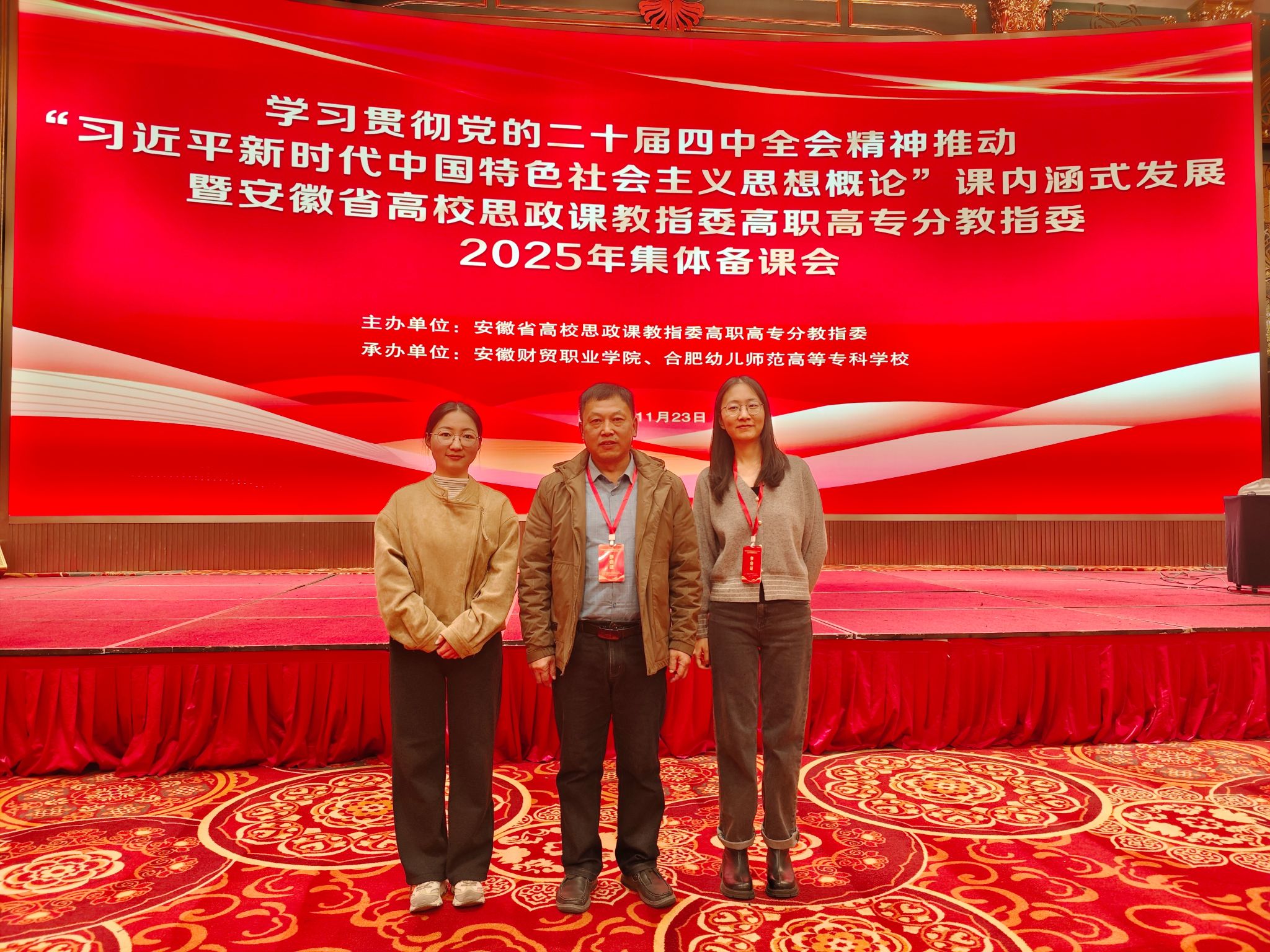 为深入学习贯彻党的二十届四中全会精神,切实推动《习近平新时代中国特色社会主义思想概论》课建设与教学质量提升,11月23日,由安徽省高校思想政治理论课教学指导委员会高职高专分教学指导委员会主办,安徽财贸职业学院、合肥幼儿师范高等专科学校共同承办的安徽省高职高专院校思政课集体备课会在合肥成功举行。马克思主义学院党总支书记、院长孔金、青年教师周明珠、李明欣参加了此次意义重大的教研活动。