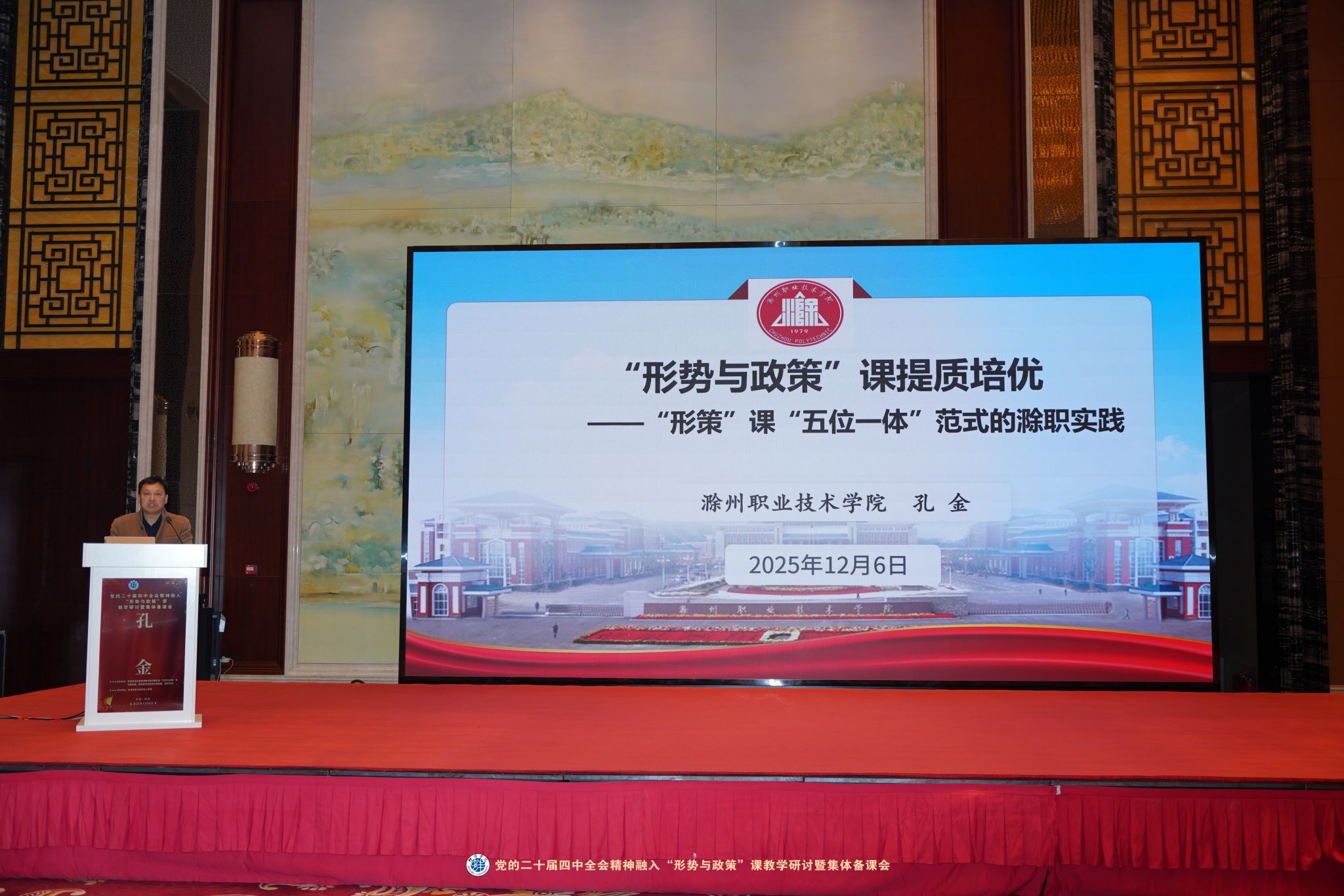 在交流发言中,来自中国科学技术大学、安徽建筑工程大学等六位马克思主义学院院长结合本校实际,就深入学习贯彻党的二十届四中全会精神,推动“形势与政策”课高质量发展作了交流分享。我校马克思主义学院总支书记、院长孔金以“‘形势与政策’提质培优——‘五位一体’范式的滁职实践”为题,从“形势与政策”课“五位一体”范式内涵解读、实施路径、取得成效以及后续工作展望等方面详细介绍了滁州职业技术学院推动“形势与政策”课内涵式发展的宝贵经验,获得与会专家和教师的高度赞赏。