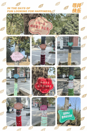 编织完成后,各小组在工作人员的带领下前往校园指定树木点位,小心翼翼地将织好的毛线围脖缠绕固定在树干上。不少小组还别出心裁地搭配了缤纷毛线球、小巧灯笼等装饰,让原本略显萧瑟的树木瞬间变得灵动鲜活,成为校园里一道道靓丽的风景。