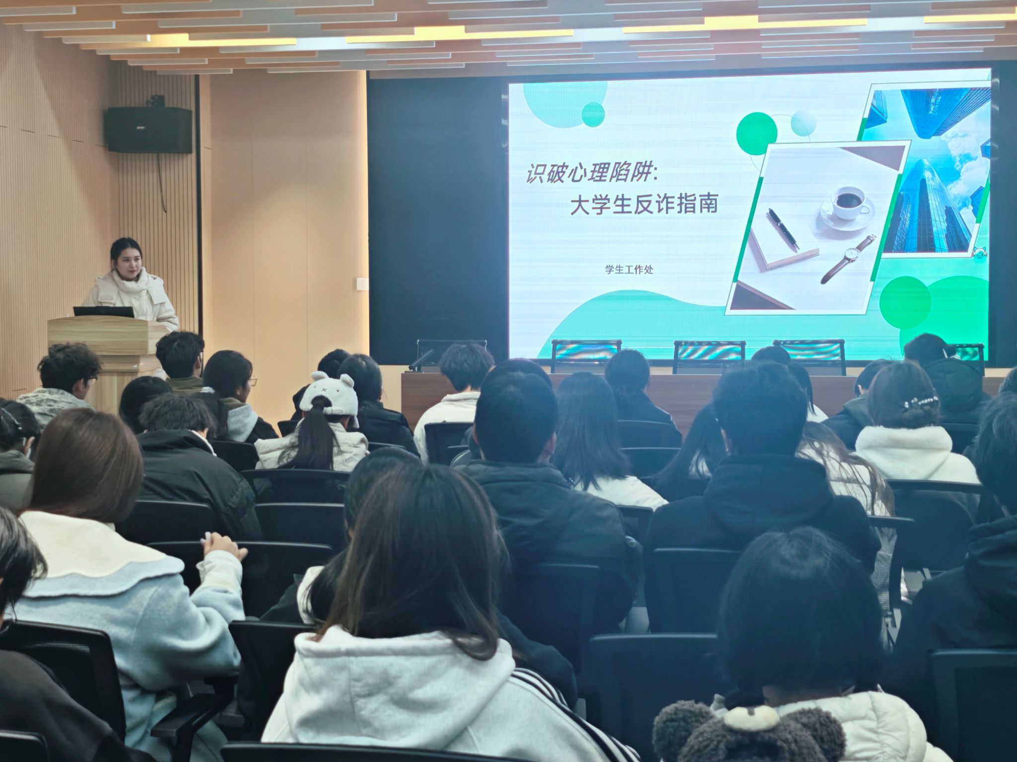 为提升我校大学生防骗识骗能力,筑牢校园反诈安全防线,守护青年学子财产安全与身心健康,营造平安和谐的校园环境。12月25日下午,学生工作处健康教育科在“一站式”学生社区报告厅开展“识破心理陷阱:大学生反诈指南”主题宣讲活动,由学生工作处健康教育科刘凯琳老师主讲,全校各学院学生代表们齐聚现场,认真聆听宣讲。