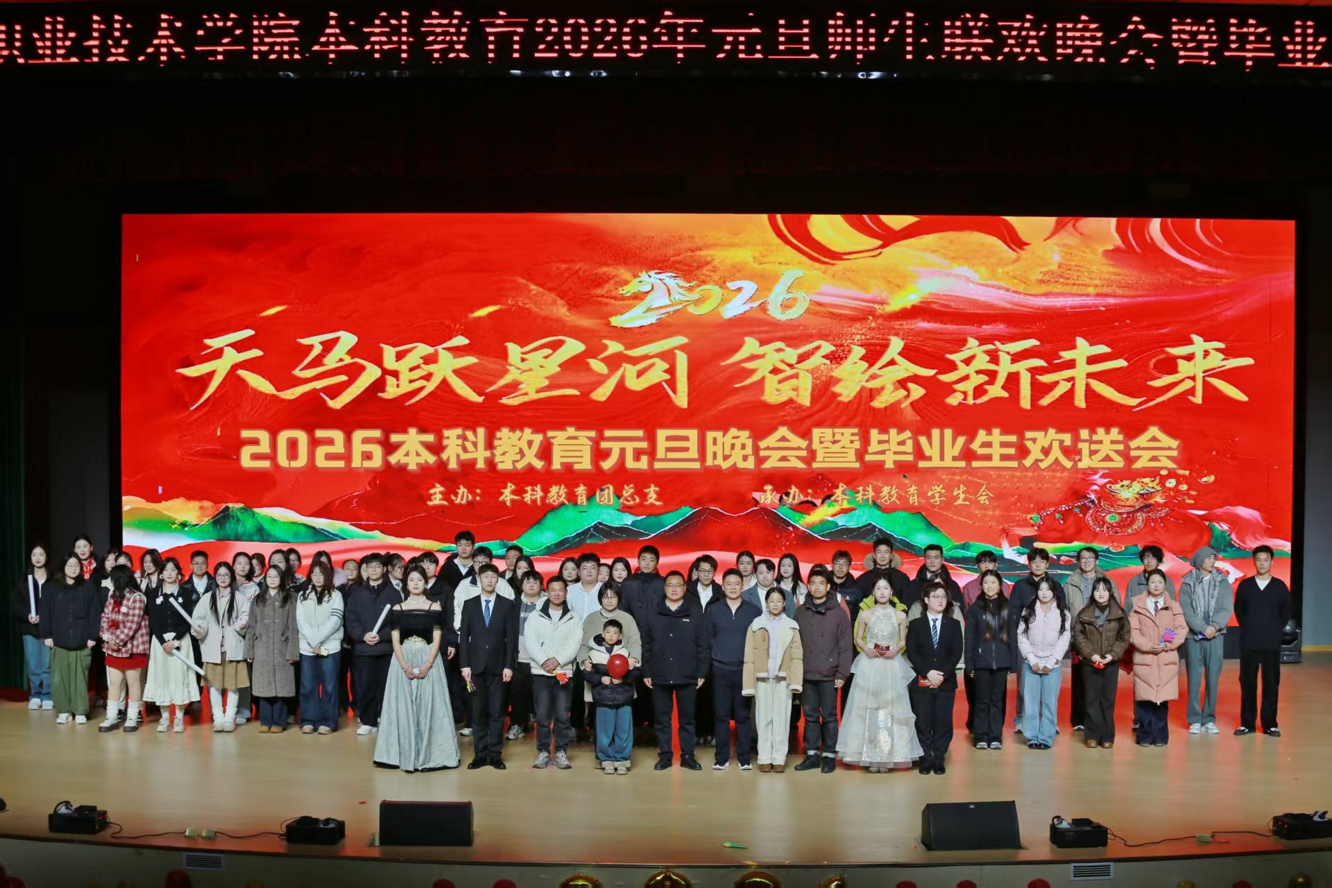 12月28日19时,大礼堂灯光璀璨、鼓乐铿锵,本科教育举行“天马跃星河,智绘新未来”2026年元旦晚会暨毕业生欢送会。校党委书记陈飏,校教务处处长、专升本联合培养办公室主任唐义武,电气工程学院党总支书记薛天飞,校团委书记甄帅,本科教育党支部书记杨阳莅临现场,与800余名师生共同迎接新年、送别2026届毕业生。