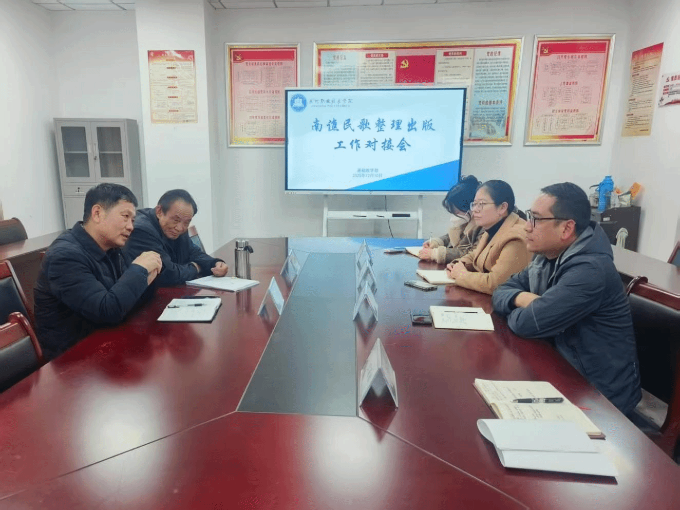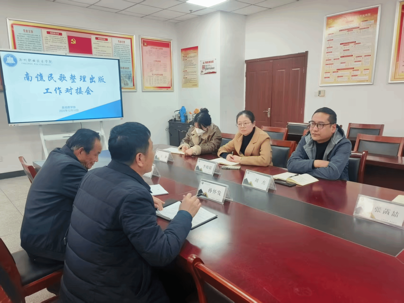 为深入推进地方优秀传统文化保护与传承,进一步落实滁州职业技术学院与南谯区文化和旅游局此前签订的横向课题合作协议,12月10日下午,双方在综合楼208会议室召开南谯民歌整理出版业务对接会,会议围绕南谯民歌的系统性整理、研究与出版等合作事宜展开深入交流。基础教学部党总支书记李晓辕、副主任(主持工作)刘杰、南谯区文化馆馆长孙怀发、大柳艺术团团长王明华及相关美育教师共同参会。