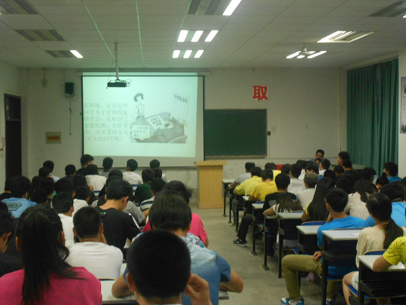 活动内容主要是通过向学生播放PPT、观看微电影,让同学们了解国家的贫困补助和各项奖学金、贷款等方面的知识。活动最后是用学生在海报上签名的方式,让他们对即将到来的期末考试写上一些祝福的话及对于诚信做人诚信做事方面的一些看法。